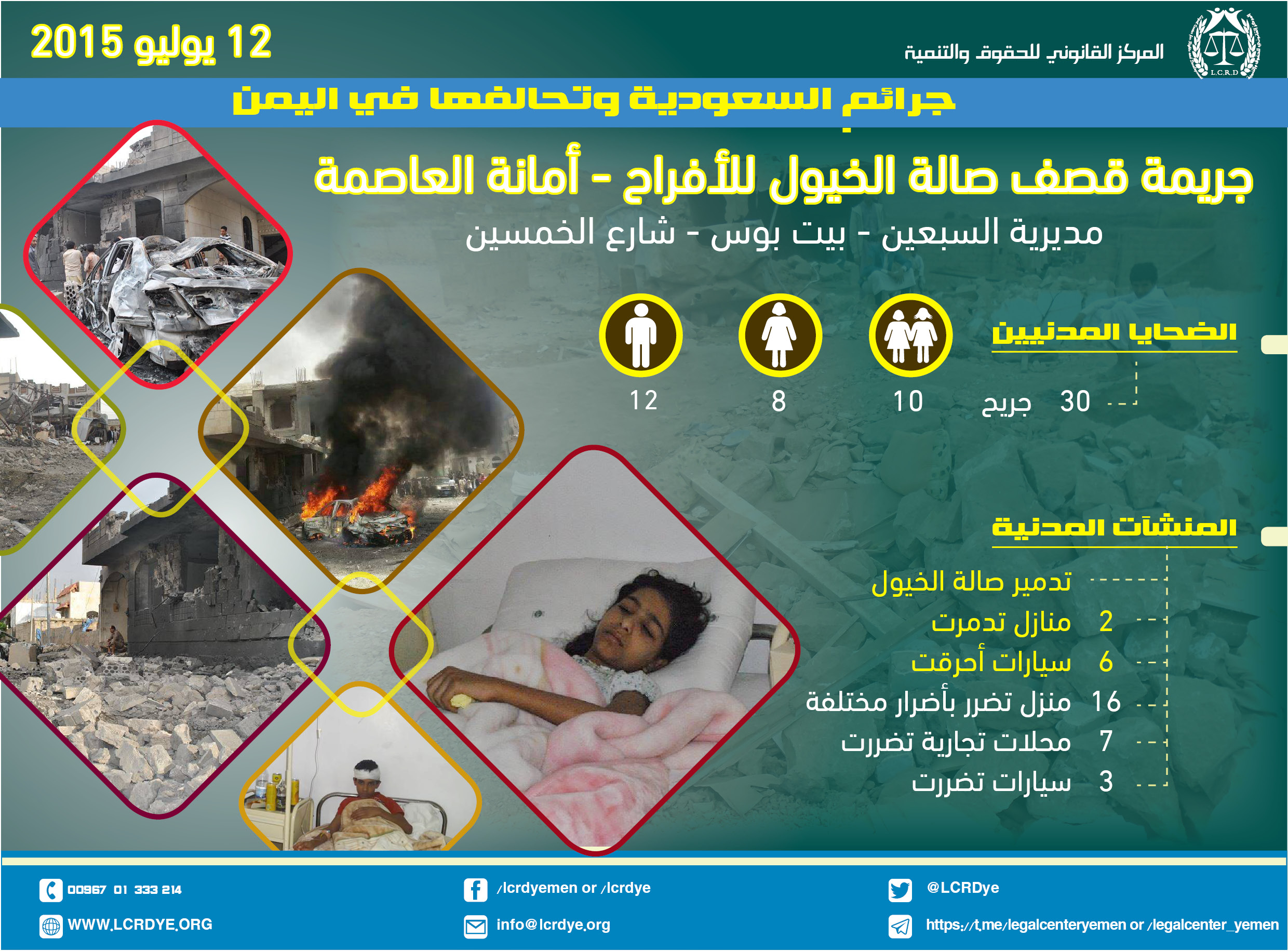 جريمة قصف صالة الخيول للأفراح والمناسبات – 12 يوليو 2015 Last updated يوليو 12, 2017 #جريمة بتاريخ 12 يوليو 2015 قصفت طائرات التحالف السعودي صالة الخيول للأفراح والمنازل المجاورة بمنطقة بيت بوس – شارع الخمسين – مديرية السبعين – أمانة العاصمة Share FacebookTwitterGoogle+ReddItWhatsAppPinterestالبريد الإلكتروني