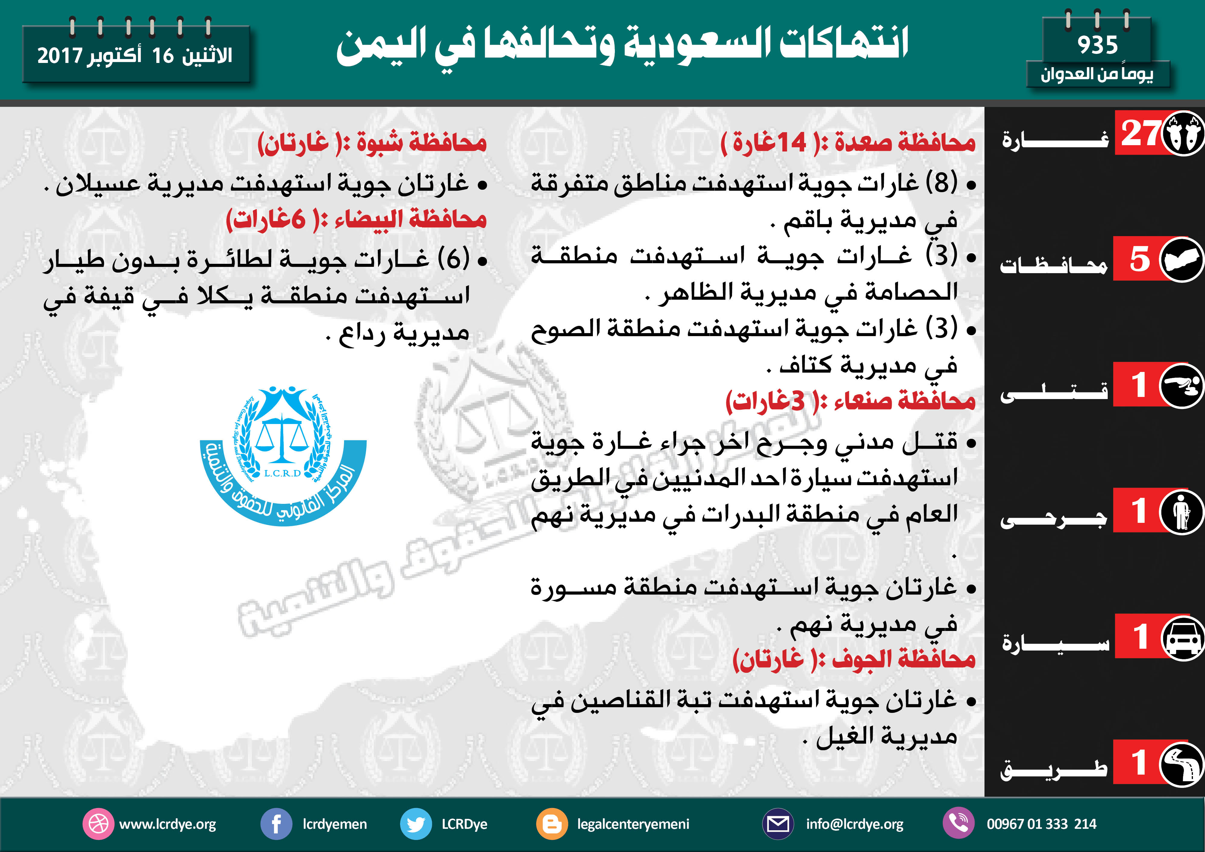 انتهاكات #السعودية_وتحالفها في اليمن الاثنين 16 اكتوبر 2017 Last updated أكتوبر 25, 2017 لتحميل التقرير برابط مباشر: Share FacebookTwitterGoogle+ReddItWhatsAppPinterestالبريد الإلكتروني
