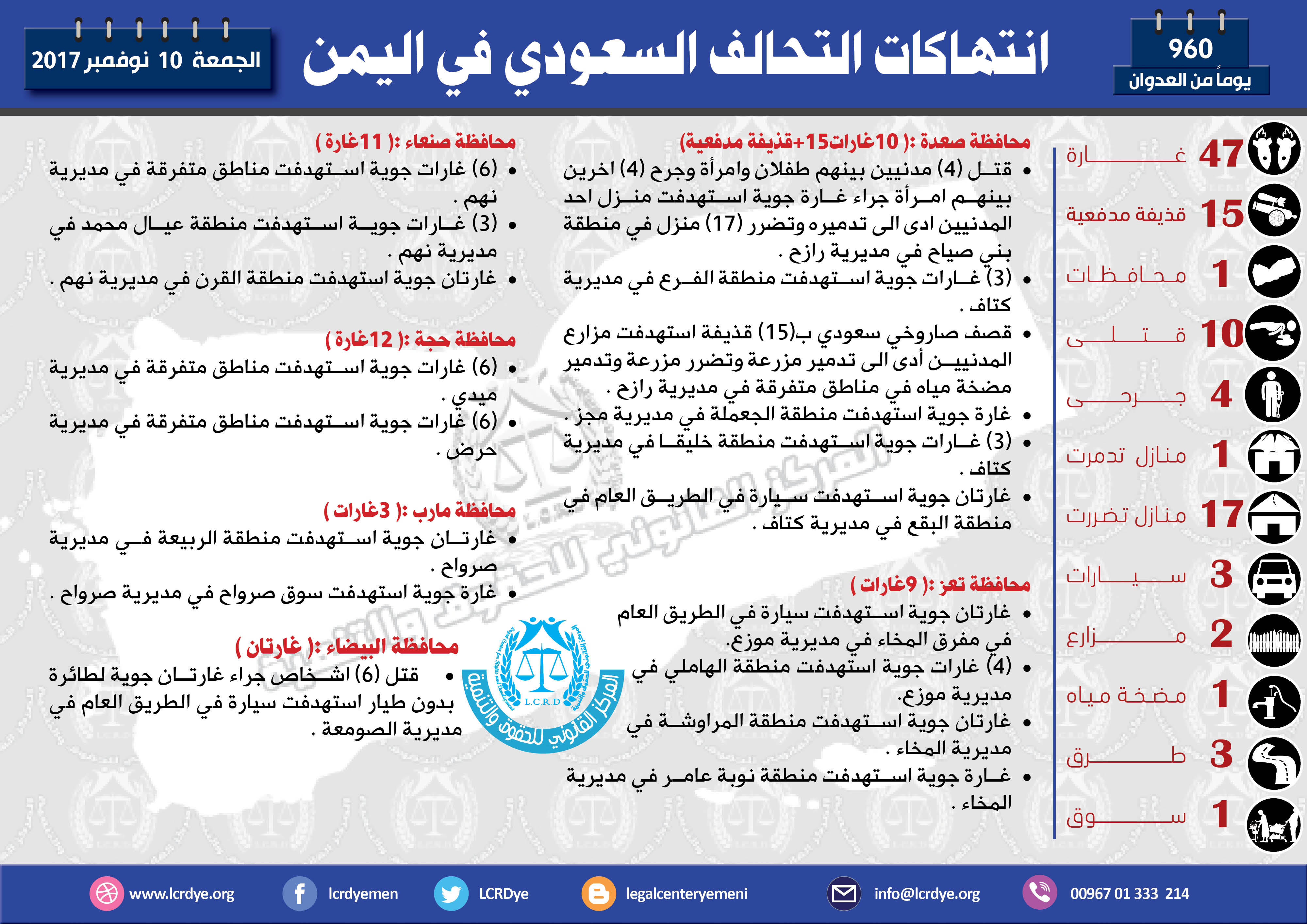 انتهاكات السعودية وتحالفها في اليمن 10 نوفمبر 2017 Last updated نوفمبر 11, 2017 لتحميل التقرير برابط مباشر: استهداف المدنييناستهداف المنشآت المدنيةاستهداف النازحيناسلحة محرمةالضحايا المدنيين في اليمنالمركز القانوني للحقوق والتنميةانتهاك القانون الدوليرصد وتوثيق انتهاكات التحالف السعودي Share FacebookTwitterGoogle+ReddItWhatsAppPinterestالبريد الإلكتروني