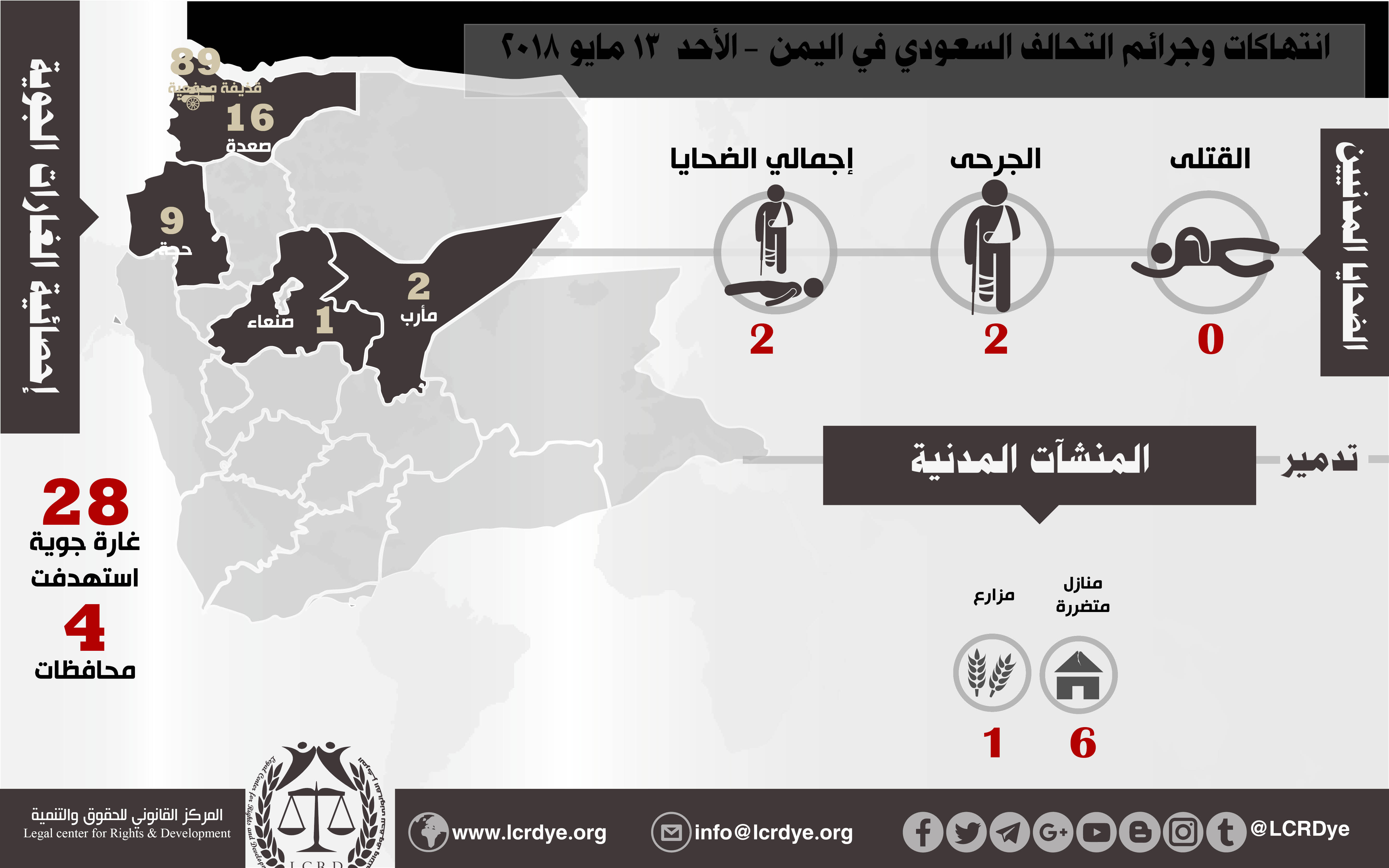 إحصائية أولية لإنتهاكات التحالف السعودي في اليمن 13 مايو 2018