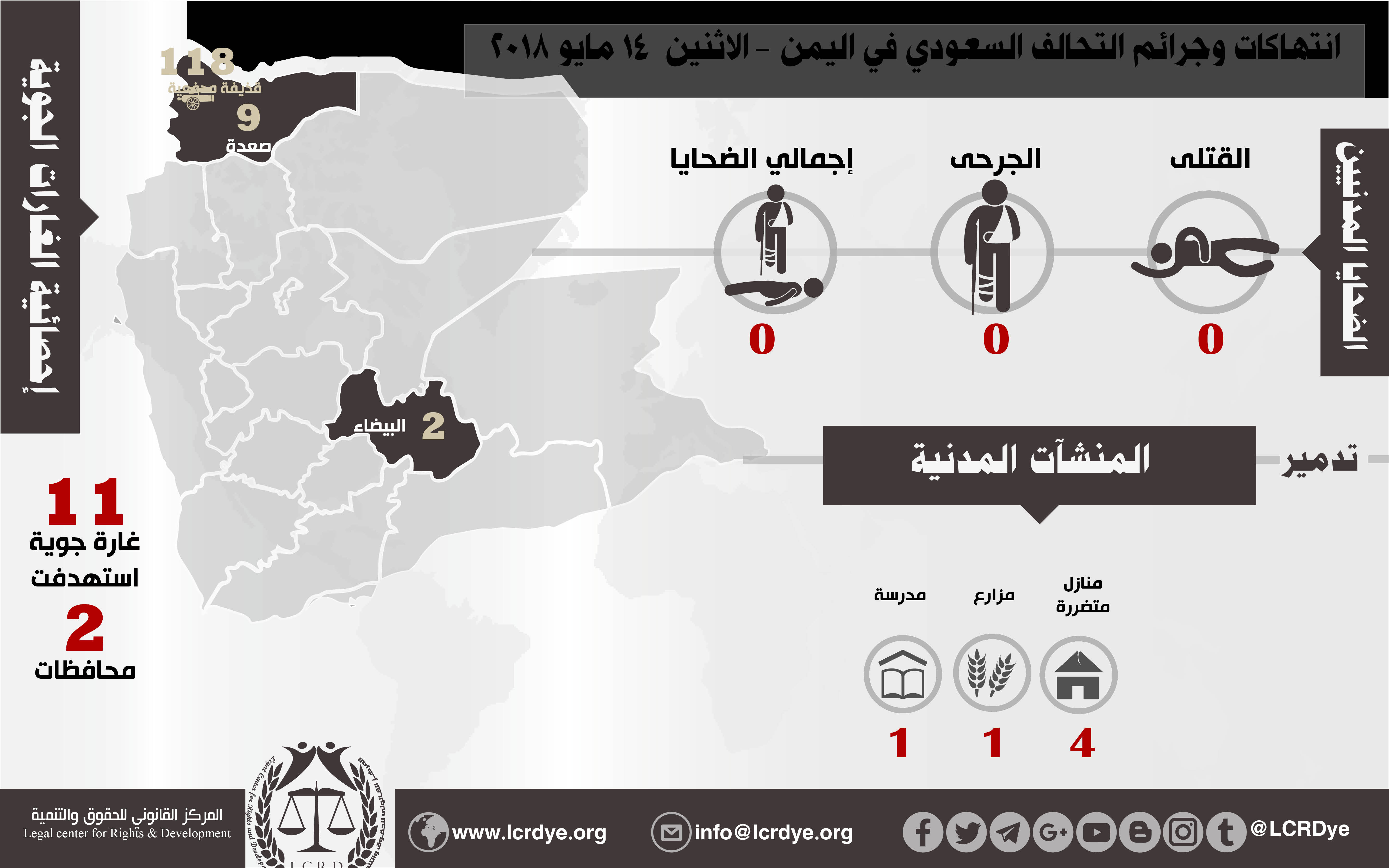 إحصائية أولية لإنتهاكات التحالف السعودي في اليمن 14 مايو 2018 Last updated مايو 15, 2018 للتحميل https://www.lcrdye.org/wp-content/uploads/2018/05/14-5-2018.pdf التحالف السعوديالمركز القانوني للحقوق والتنميةاليمن Share FacebookTwitterGoogle+ReddItWhatsAppPinterestالبريد الإلكتروني