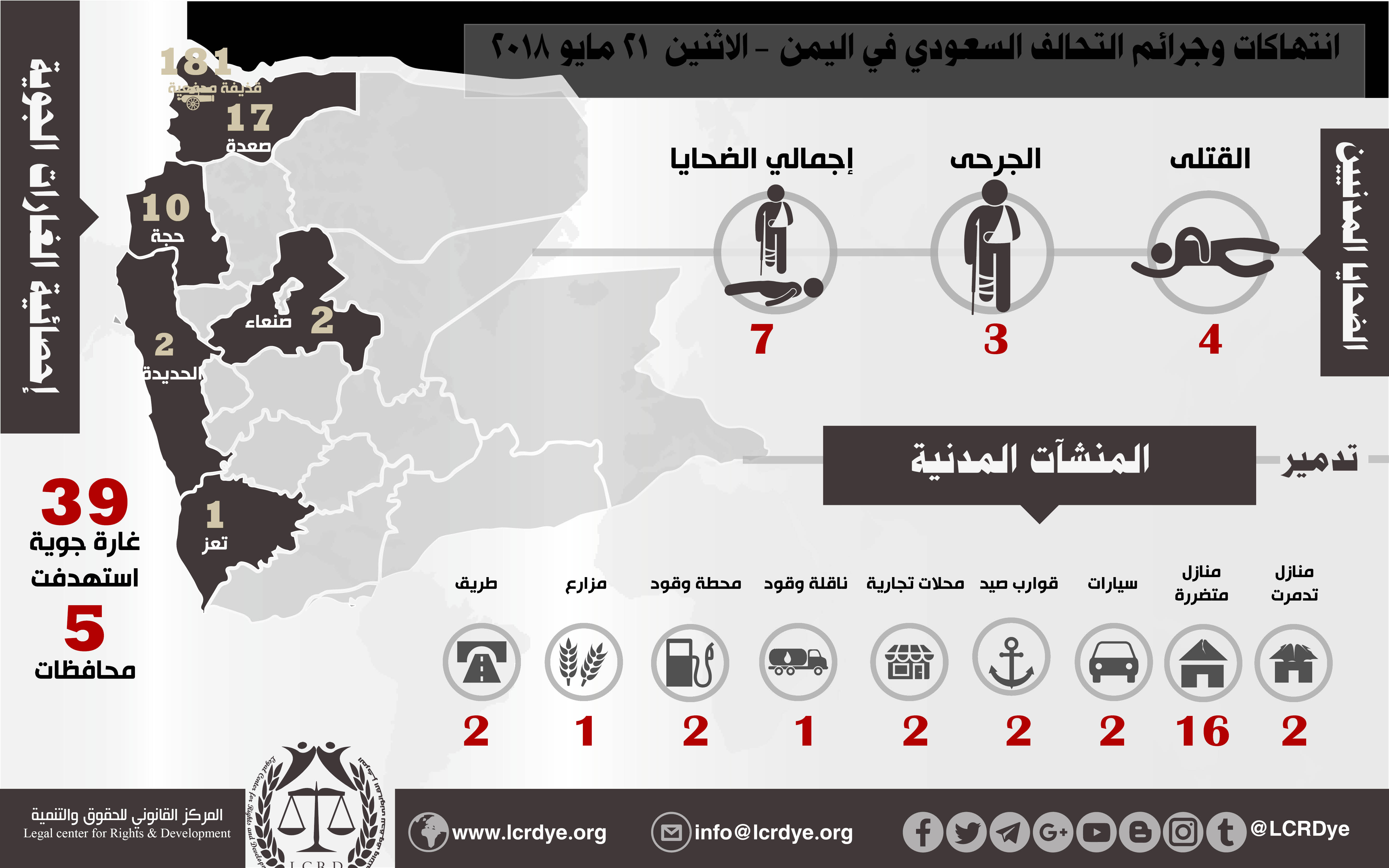 إحصائية أولية لإنتهاكات التحالف السعودي في اليمن 21 مايو 2018 Last updated مايو 22, 2018 للتحميل https://www.lcrdye.org/wp-content/uploads/2018/05/21-5-2018.pdf استهداف المنشآت المدنيةالتحالف السعوديالمركز القانوني للحقوق والتنميةاليمن Share FacebookTwitterGoogle+ReddItWhatsAppPinterestالبريد الإلكتروني