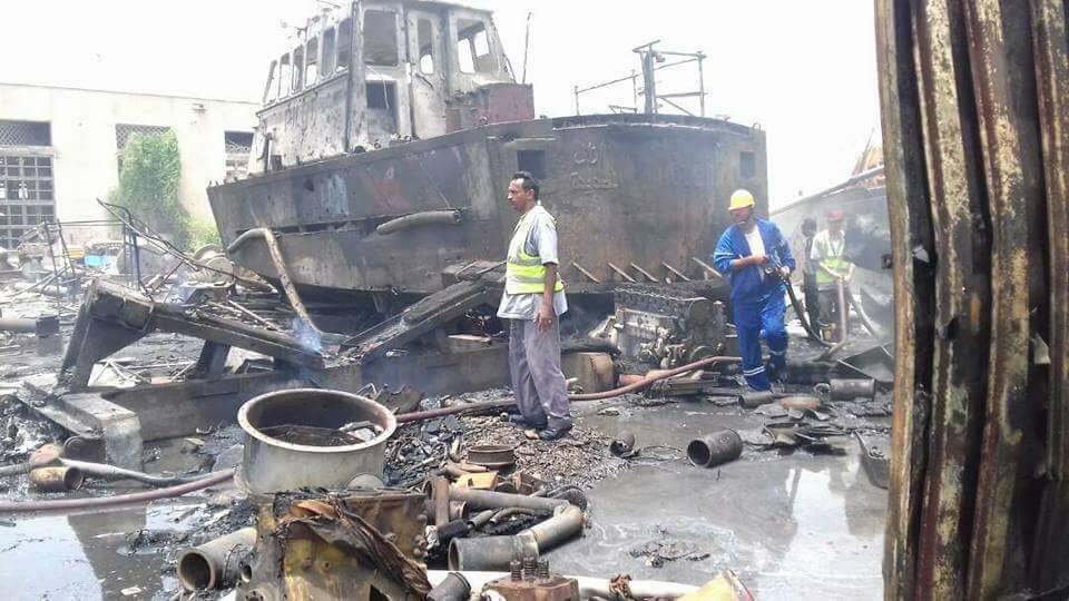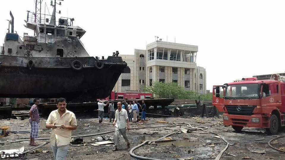 جريمة قصف ونش بحري خاص بصيانة العائمات البحرية في منزلق الشؤون البحرية داخل ميناء الحديدة 28-5-2018