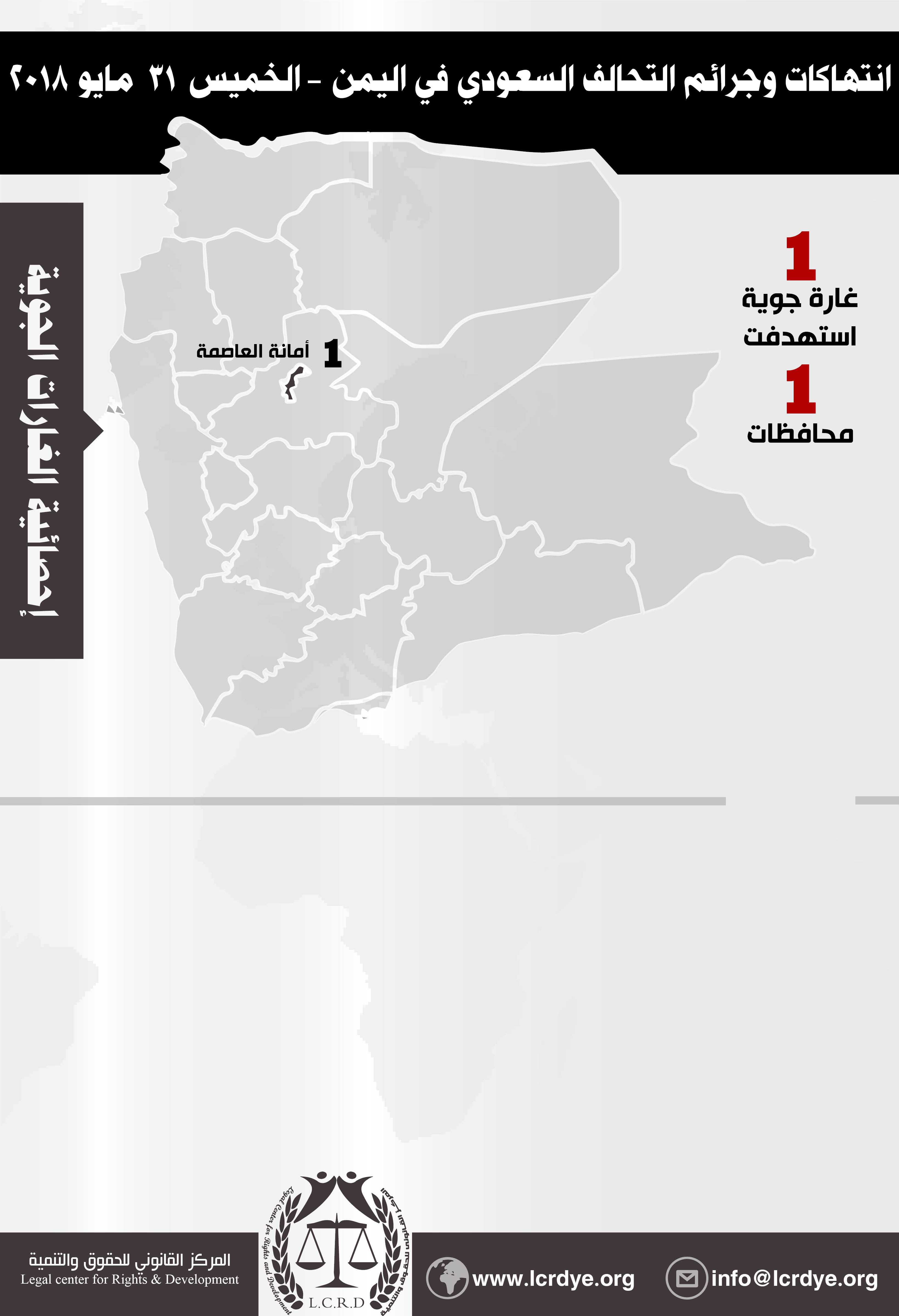 إحصائية أولية لإنتهاكات التحالف السعودي في اليمن 31 مايو 2018 Last updated يونيو 3, 2018 للتحميل https://www.lcrdye.org/wp-content/uploads/2018/06/31-5-2018.pdf التحالف السعوديالمركز القانوني للحقوق والتنميةاليمن Share FacebookTwitterGoogle+ReddItWhatsAppPinterestالبريد الإلكتروني