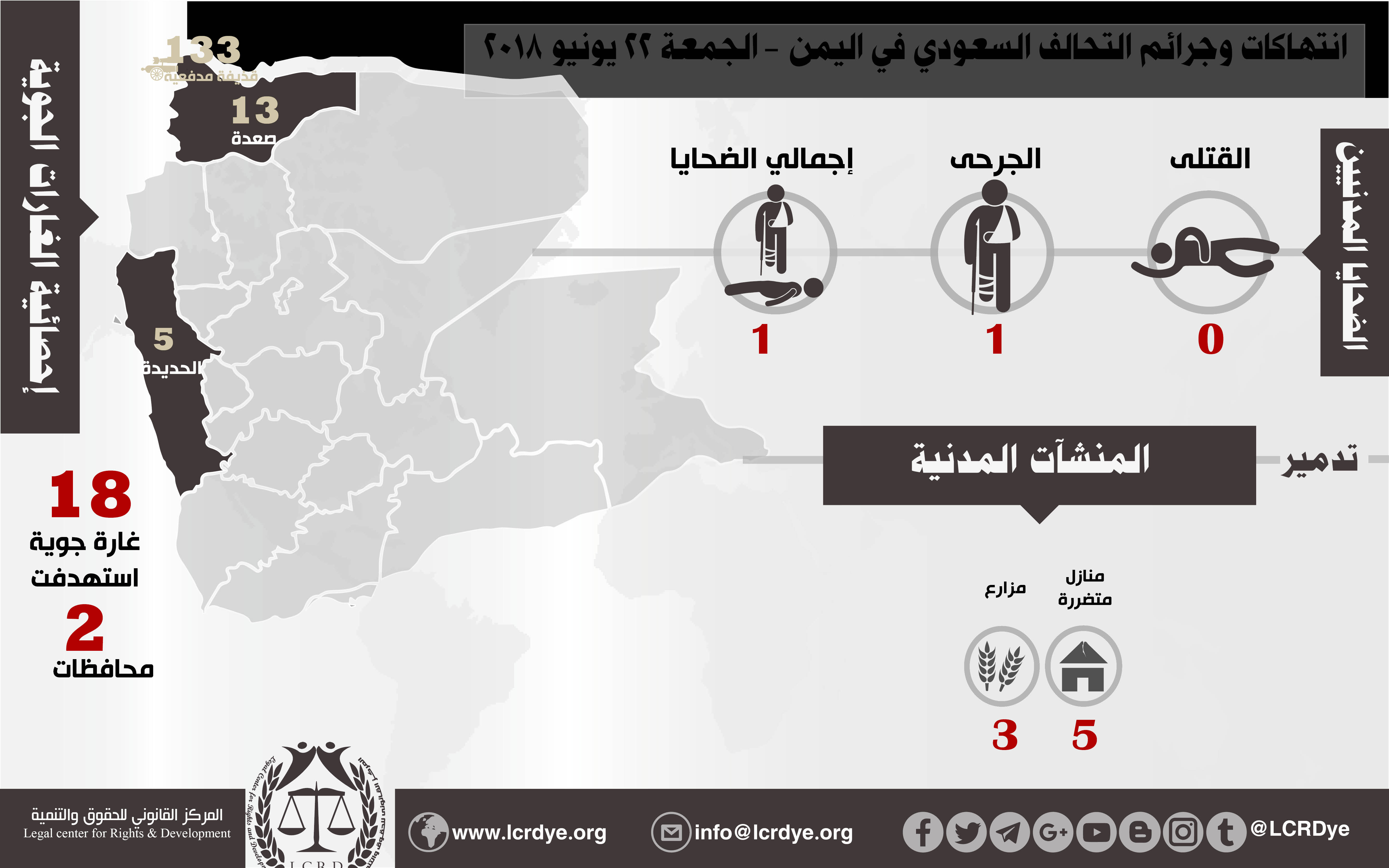 إحصائية أولية لإنتهاكات التحالف السعودي في اليمن 22 يونيو 2018 Last updated يونيو 27, 2018 للتحميل https://www.lcrdye.org/wp-content/uploads/2018/06/22-6-2018.pdf التحالف السعوديالمركز القانوني للحقوق والتنميةاليمن Share FacebookTwitterGoogle+ReddItWhatsAppPinterestالبريد الإلكتروني