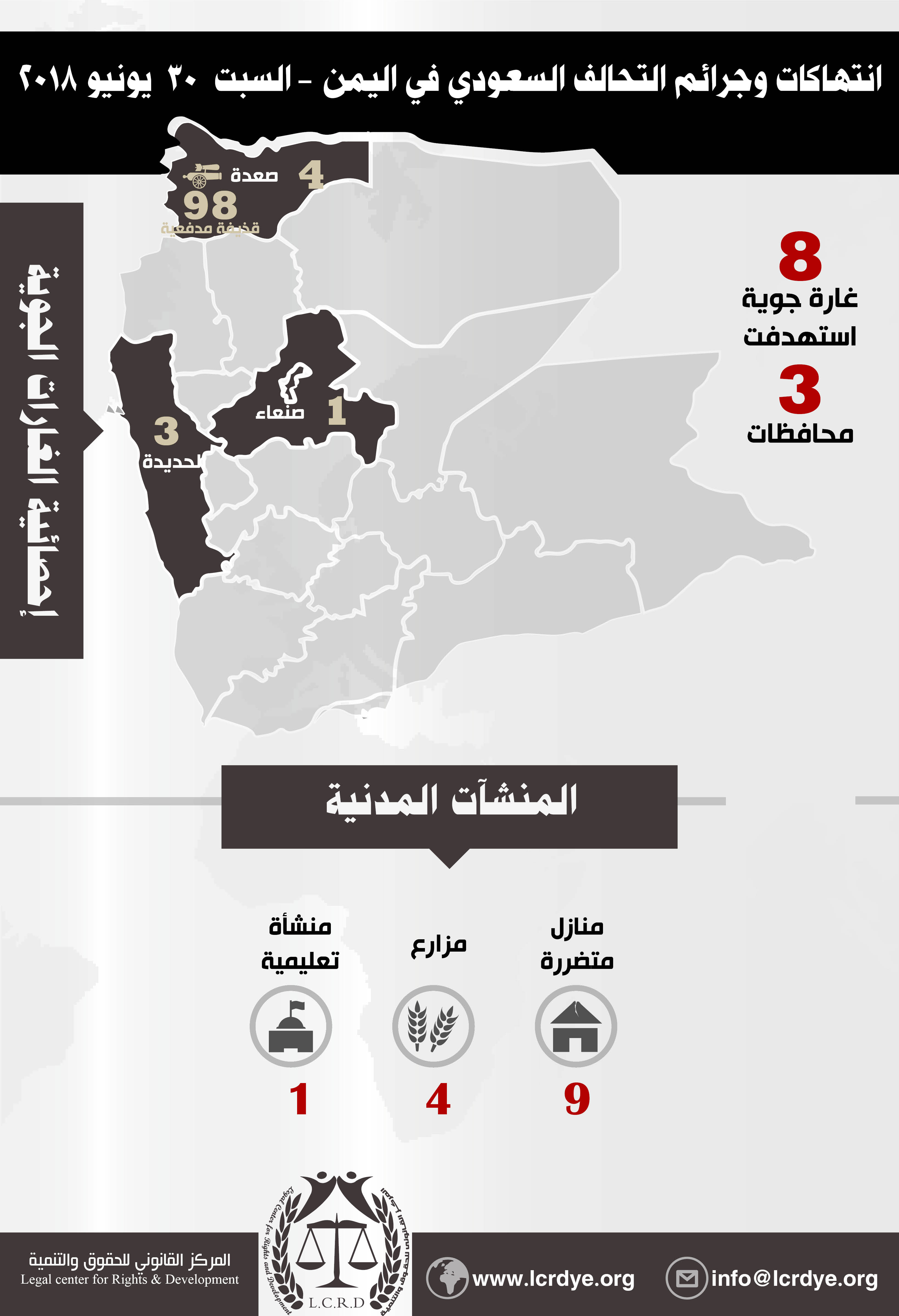 إحصائية أولية لإنتهاكات التحالف السعودي في اليمن 30 يونيو 2018 Last updated يوليو 1, 2018 للتحميل https://www.lcrdye.org/wp-content/uploads/2018/07/30-6-2018.pdf التحالف السعودي Share FacebookTwitterGoogle+ReddItWhatsAppPinterestالبريد الإلكتروني