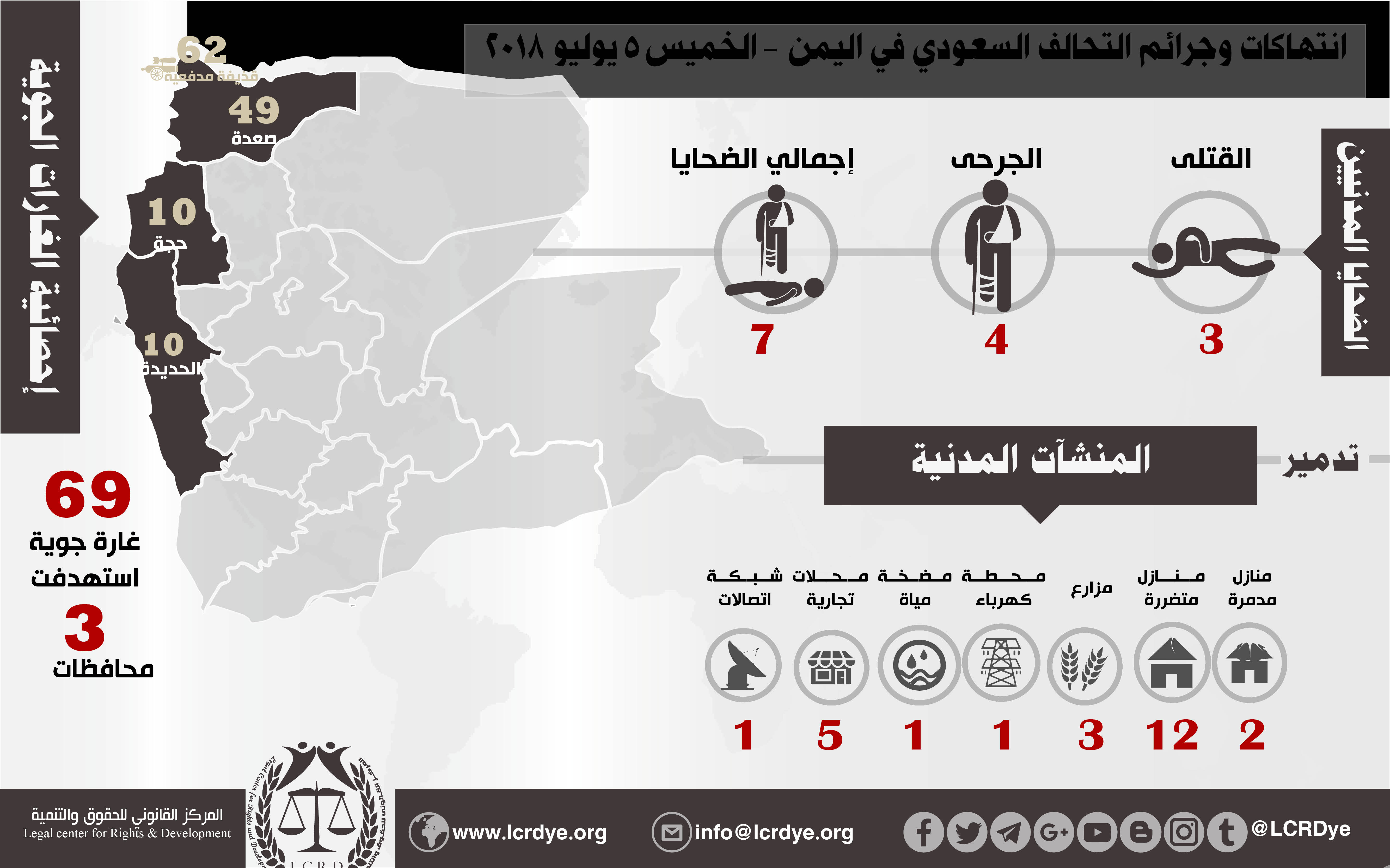 إحصائية أولية لإنتهاكات التحالف السعودي في اليمن 5 يوليو 2018 Last updated يوليو 7, 2018 للتحميل https://www.lcrdye.org/wp-content/uploads/2018/07/5-7-2018.pdf استهداف المدنيينالتحالف السعوديالمركز القانوني للحقوق والتنميةاليمن Share FacebookTwitterGoogle+ReddItWhatsAppPinterestالبريد الإلكتروني