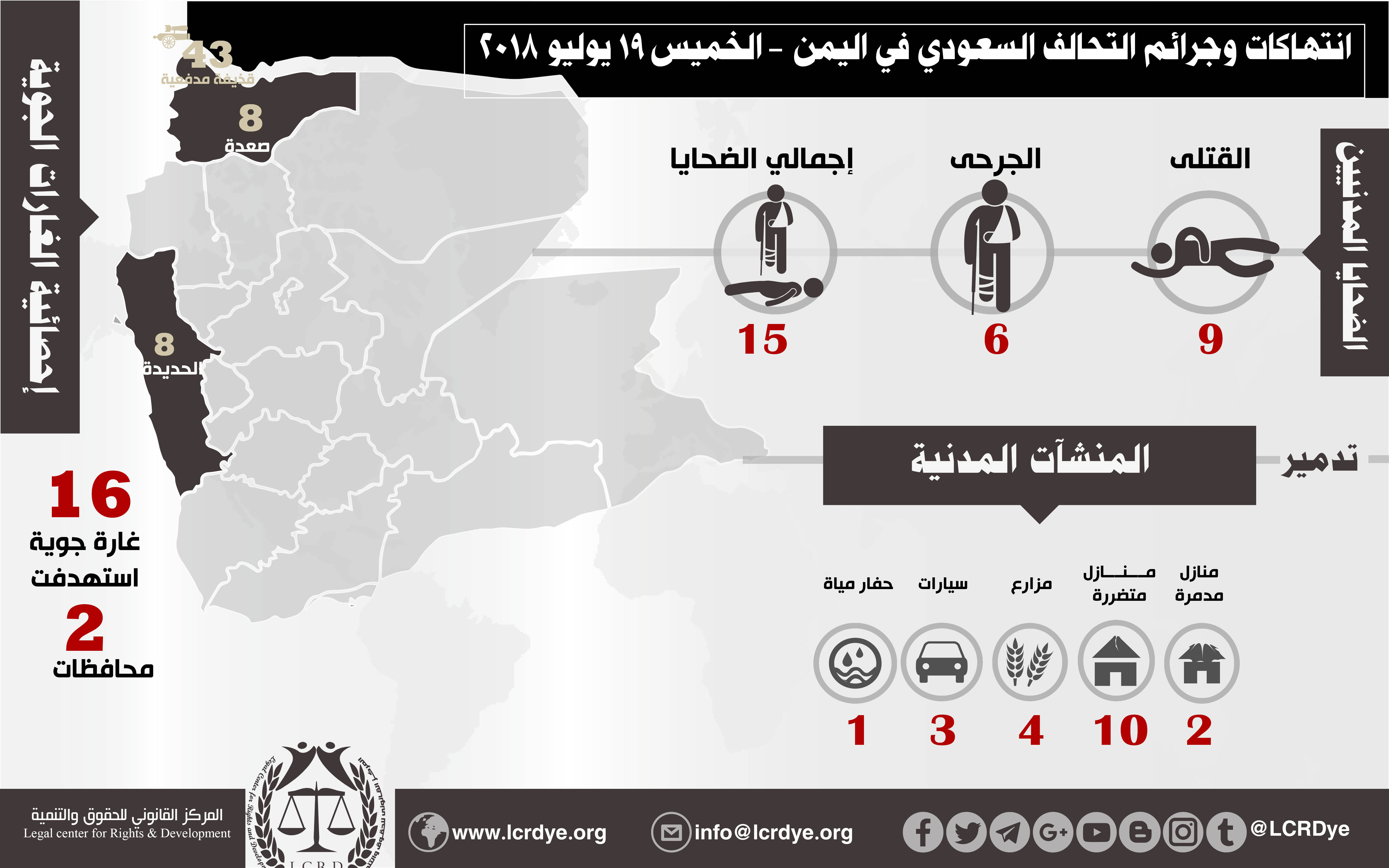 إحصائية أولية لإنتهاكات التحالف السعودي في اليمن 19 يوليو 2018 Last updated يوليو 21, 2018 للتحميل https://www.lcrdye.org/wp-content/uploads/2018/07/19-7-2018.pdf التحالف السعوديالمركز القانوني للحقوق والتنميةاليمن Share FacebookTwitterGoogle+ReddItWhatsAppPinterestالبريد الإلكتروني