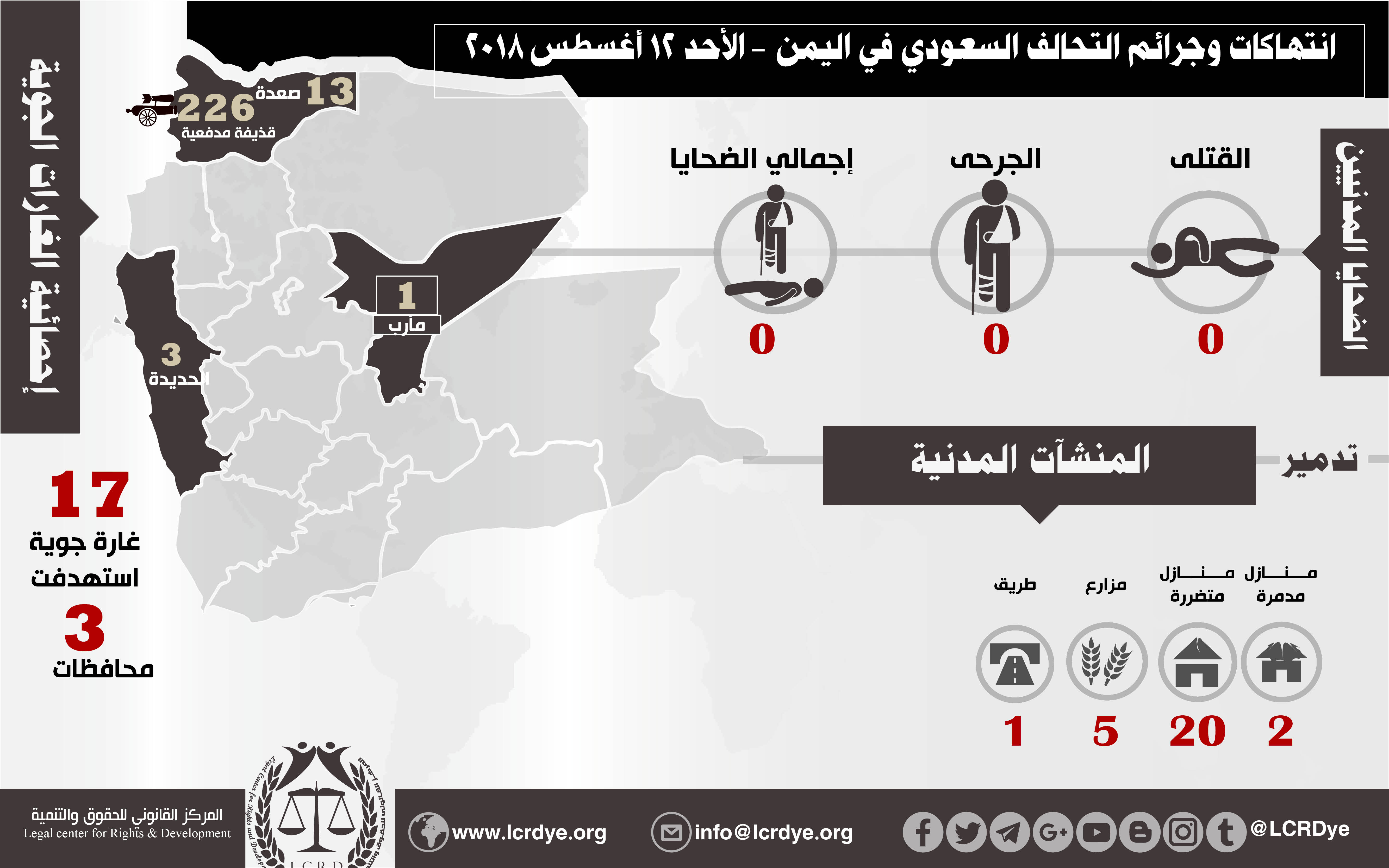 إحصائية أولية لإنتهاكات التحالف السعودي في اليمن 12 أغسطس 2018 Last updated أغسطس 13, 2018 للتحميل : استهداف البنى التحتيةاستهداف المنشآت المدنيةالتحالف السعوديالضحايا المدنيين في اليمنالمركز القانوني للحقوق والتنميةاليمنعاصفة الحزمغارات التحالف السعودي على اليمن Share FacebookTwitterGoogle+ReddItWhatsAppPinterestالبريد الإلكتروني