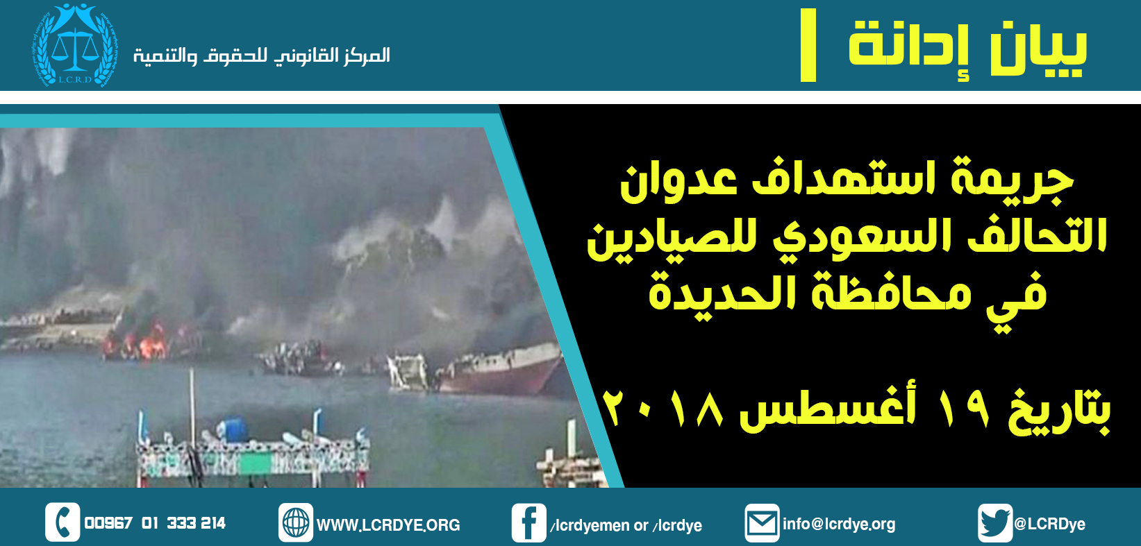 بيان إدانة| جريمة استهداف عدوان التحالف السعودي للصيادين في محافظة الحديدة بتاريخ 19 أغسطس 2018م