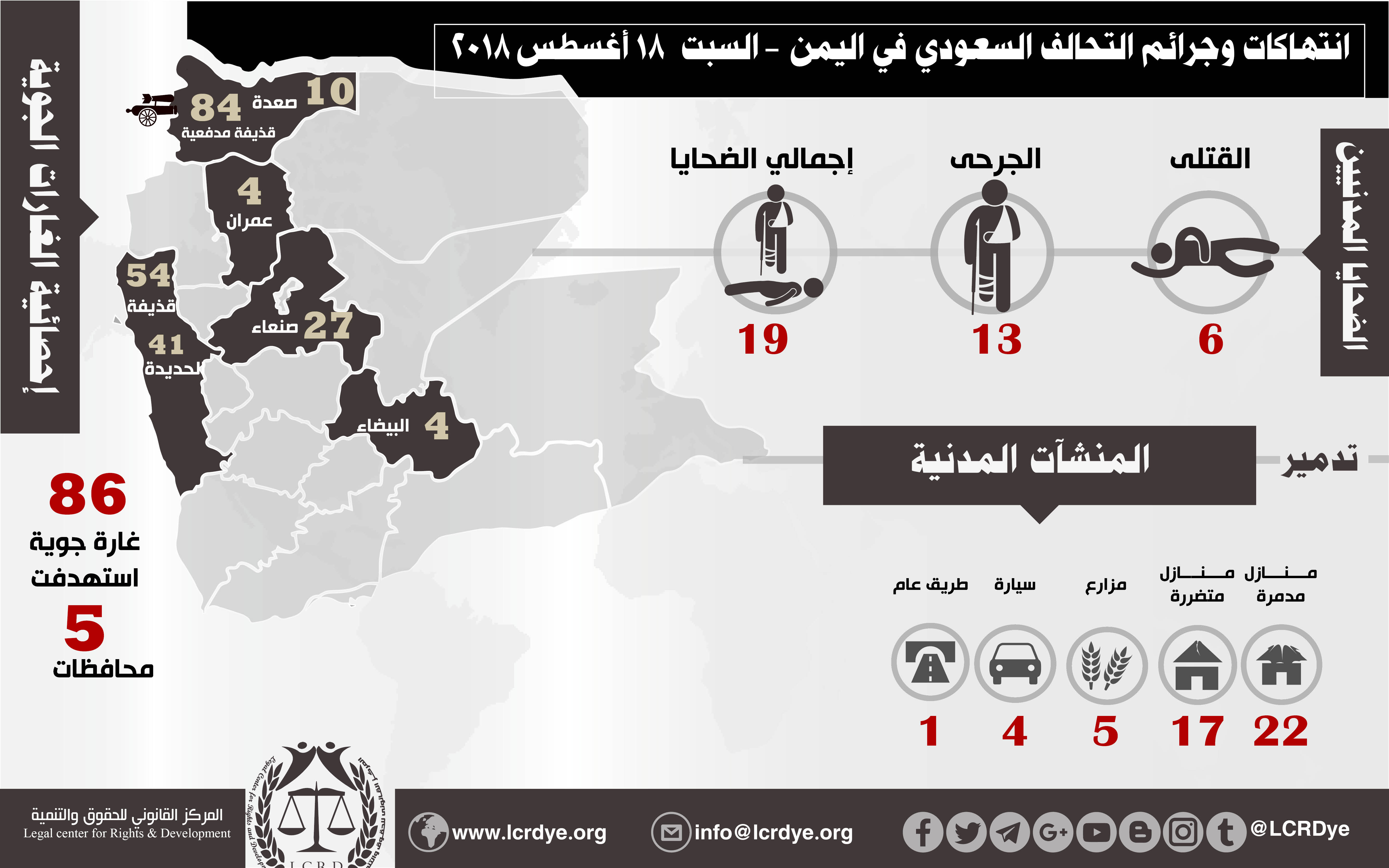 إحصائية أولية لإنتهاكات التحالف السعودي في اليمن 18 أغسطس 2018 Last updated أغسطس 29, 2018 للتحميل : استهداف البنى التحتيةاستهداف المدنيينالتحالف السعوديالضحايا المدنيين في اليمنالمركز القانوني للحقوق والتنميةاليمنعاصفة الحزمغارات التحالف السعودي على اليمن Share FacebookTwitterGoogle+ReddItWhatsAppPinterestالبريد الإلكتروني