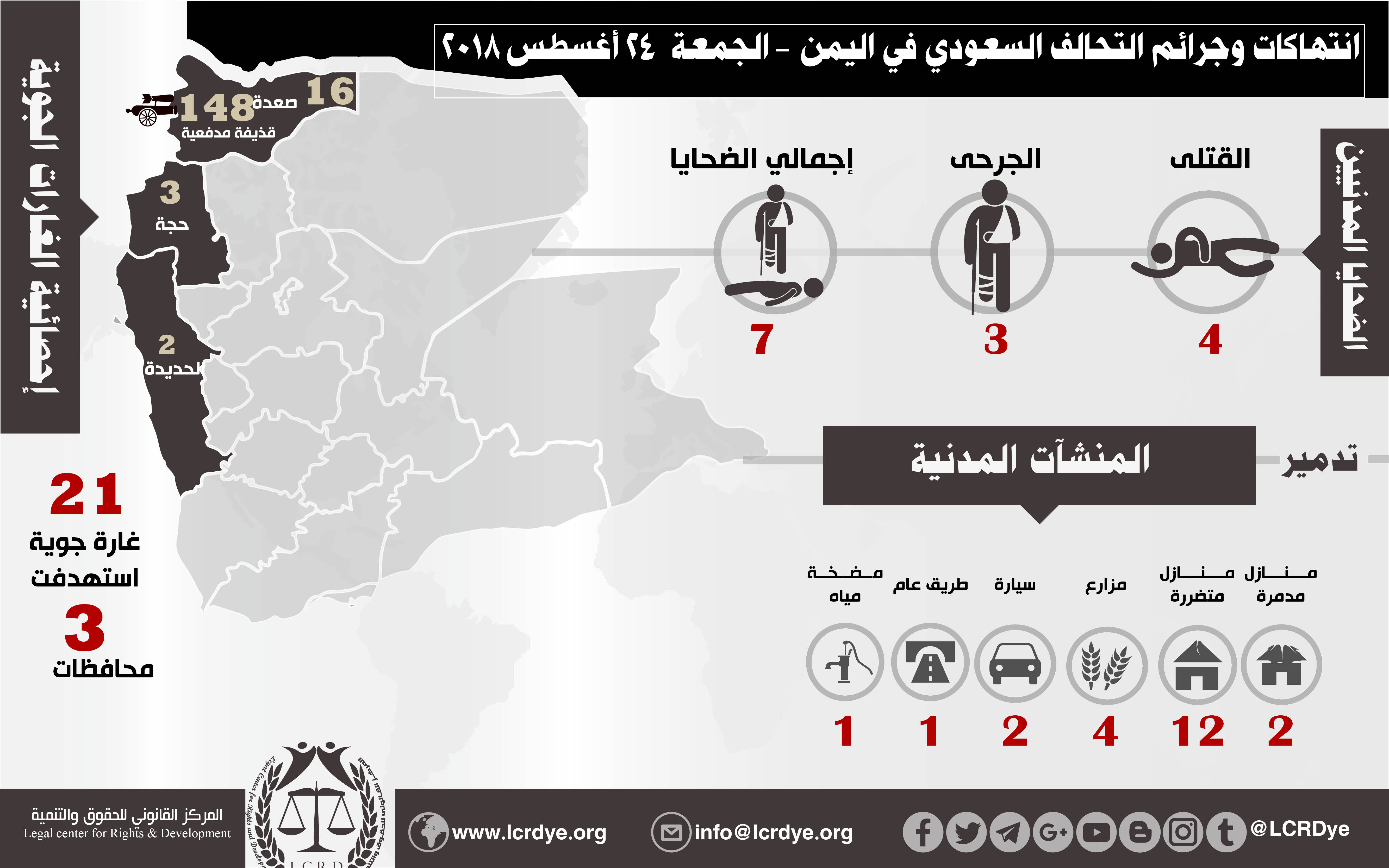 إحصائية أولية لإنتهاكات التحالف السعودي في اليمن 24 أغسطس 2018 Last updated أغسطس 29, 2018 للتحميل : استهداف البنى التحتيةالتحالف السعوديالضحايا المدنيين في اليمنالمركز القانوني للحقوق والتنميةاليمنجرائم ضد الانسانيةعاصفة الحزمغارات التحالف السعودي على اليمن Share FacebookTwitterGoogle+ReddItWhatsAppPinterestالبريد الإلكتروني