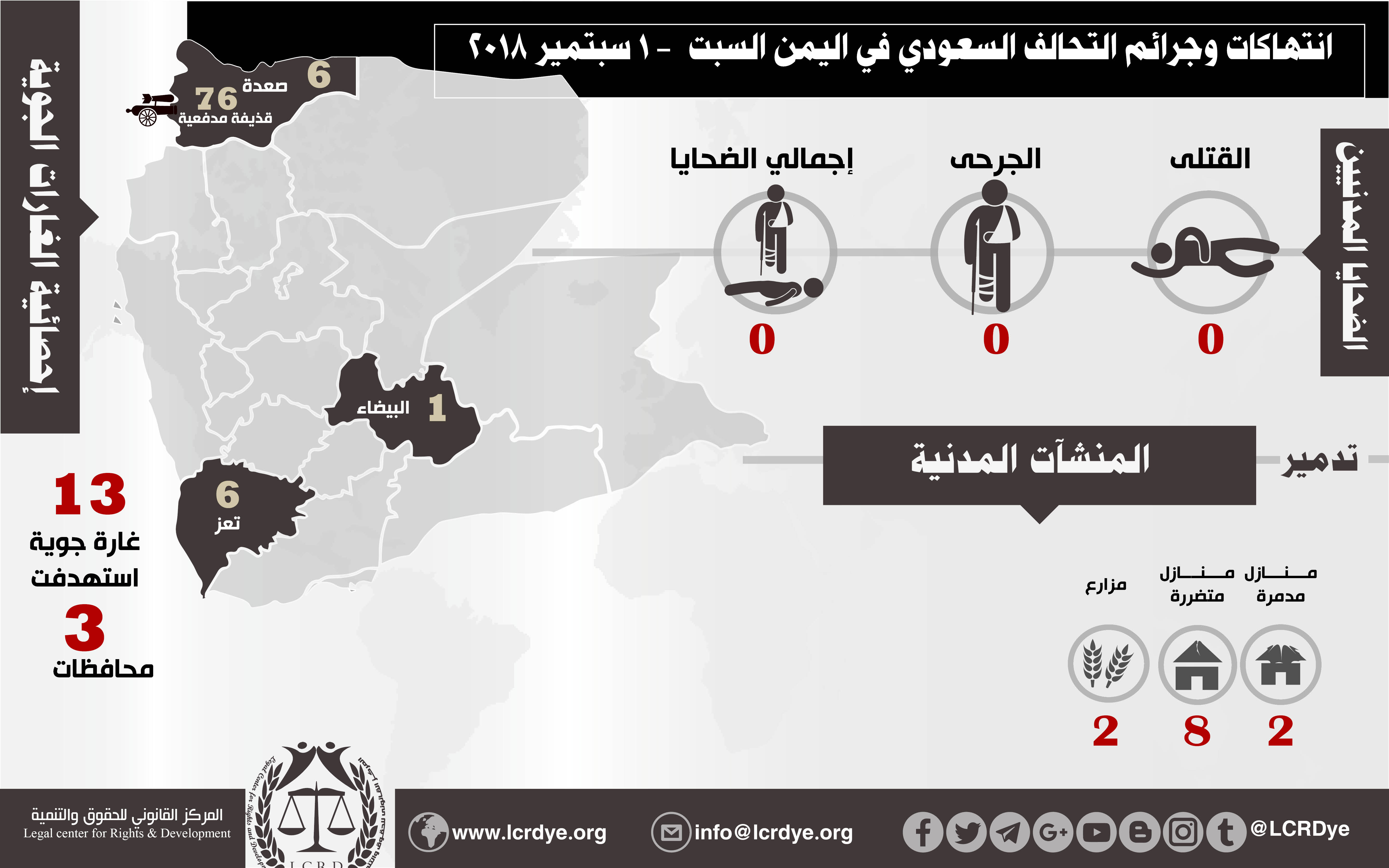إحصائية أولية لإنتهاكات التحالف السعودي في اليمن 1 سبتمبر 2018 Last updated سبتمبر 9, 2018 للتحميل https://www.lcrdye.org/wp-content/uploads/2018/09/1-9-2018.pdf التحالف السعوديالمركز القانوني للحقوق والتنميةاليمن Share FacebookTwitterGoogle+ReddItWhatsAppPinterestالبريد الإلكتروني