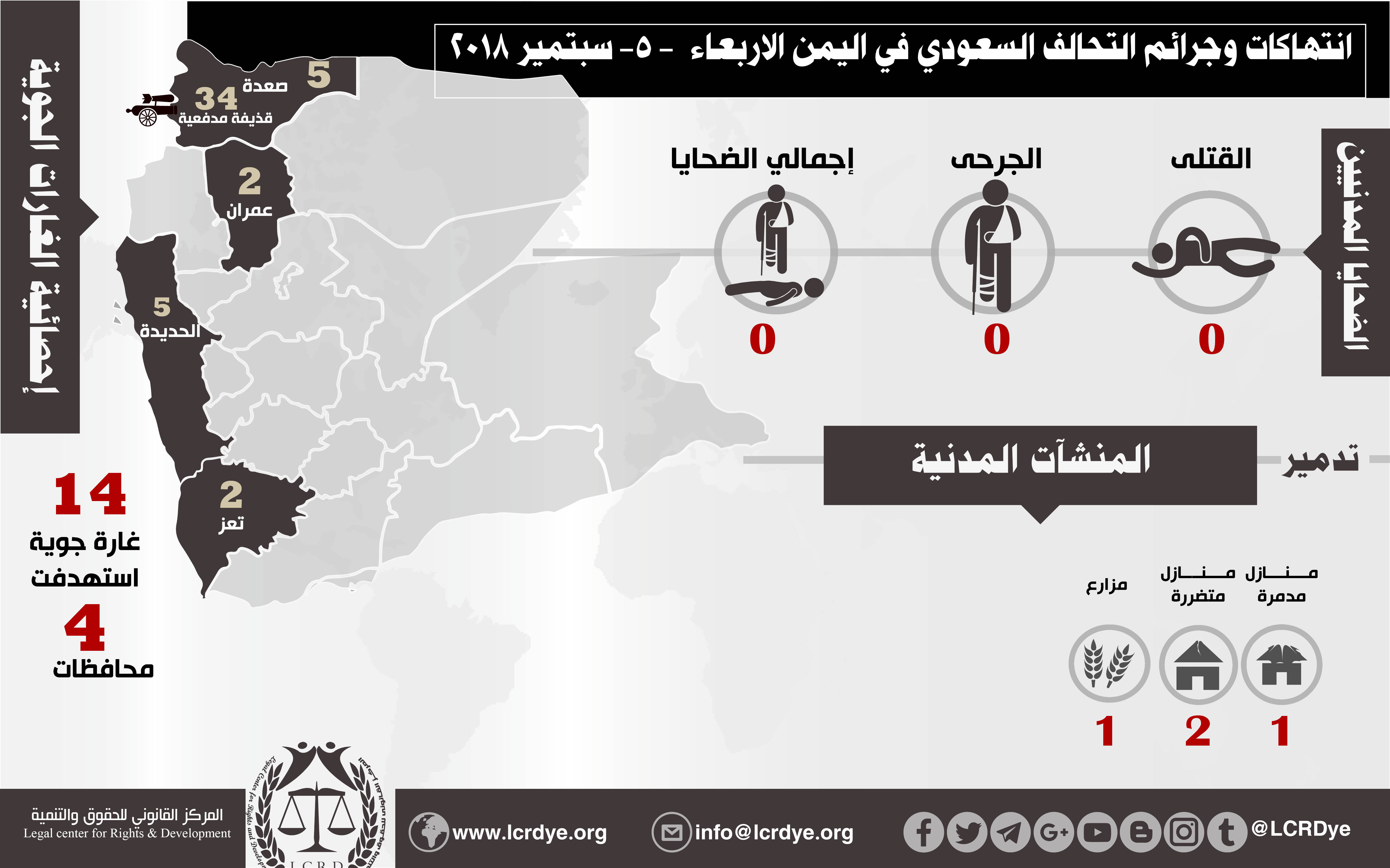 إحصائية أولية لإنتهاكات التحالف السعودي في اليمن 5 سبتمبر 2018 Last updated سبتمبر 10, 2018 للتحميل https://www.lcrdye.org/wp-content/uploads/2018/01/pdf.jpg استهداف البنى التحتيةاستهداف المدنييناستهداف المنشآت الاقتصاديةالحقوق والتنميةالمركز القانوني للحقوق والتنميةاليمنعاصفة الحزمغارات التحالف السعودي على اليمن Share FacebookTwitterGoogle+ReddItWhatsAppPinterestالبريد الإلكتروني