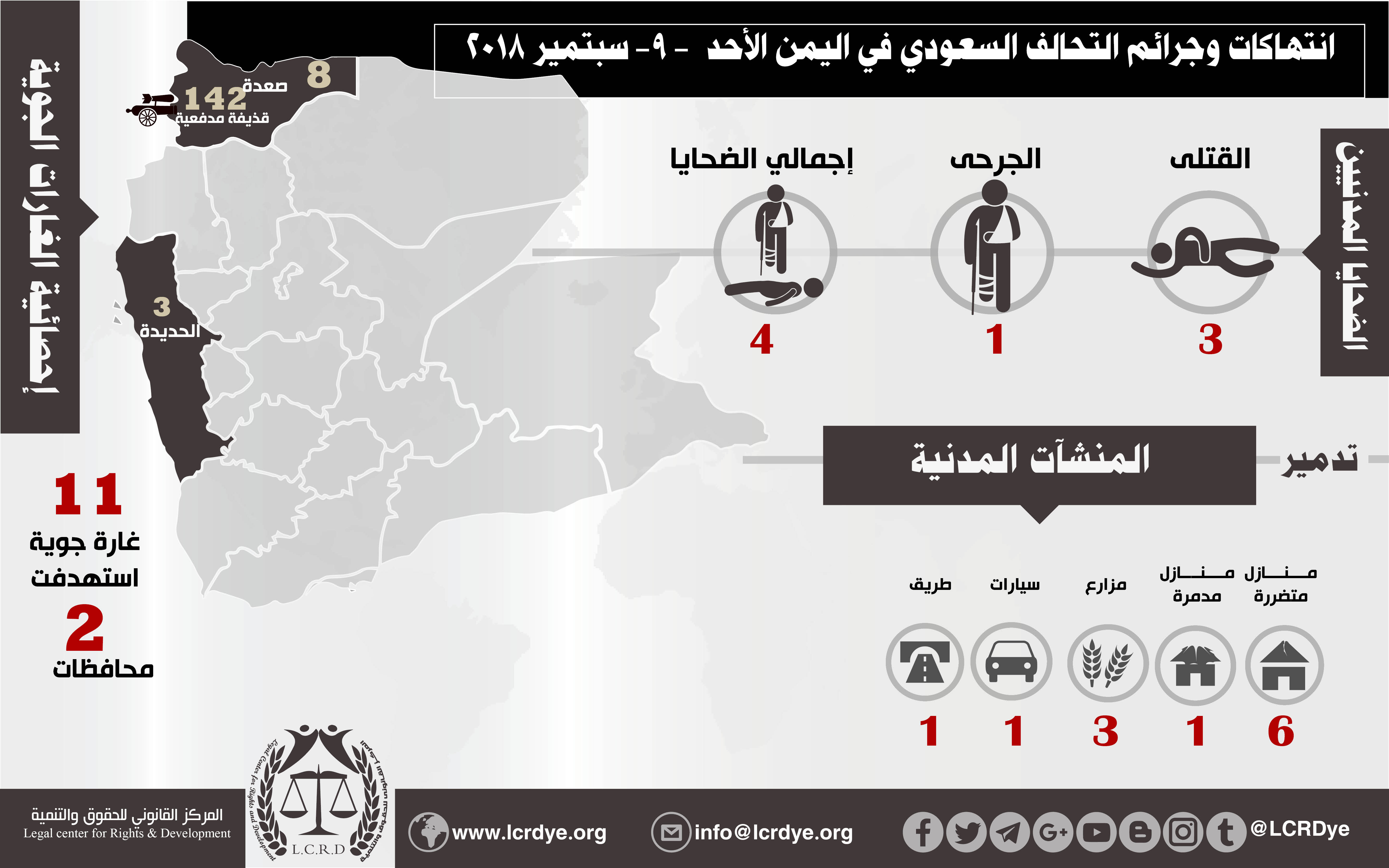 إحصائية أولية لإنتهاكات التحالف السعودي في اليمن 9 سبتمبر 2018 Last updated سبتمبر 10, 2018 للتحميل https://www.lcrdye.org/wp-content/uploads/2018/09/5-9-2018.pdf التحالف السعوديالمركز القانوني للحقوق والتنميةاليمن Share FacebookTwitterGoogle+ReddItWhatsAppPinterestالبريد الإلكتروني
