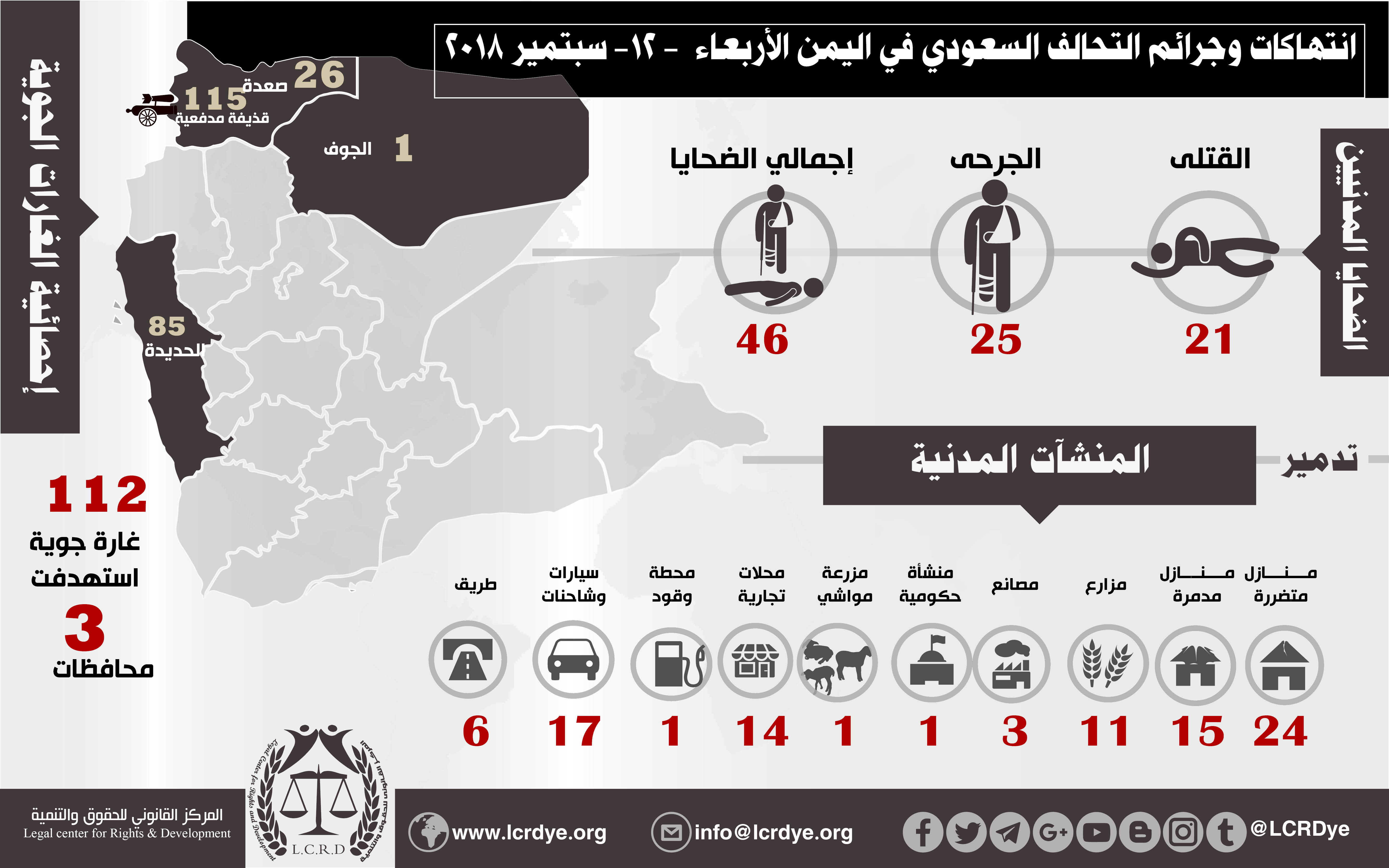 إحصائية أولية لإنتهاكات التحالف السعودي في اليمن 12 سبتمبر 2018 Last updated سبتمبر 18, 2018 للتحميل : https://www.lcrdye.org/wp-content/uploads/2018/09/12-9-2018-1.pdf استهداف المنشآت المدنيةالضحايا المدنيين في اليمنالمركز القانوني للحقوق والتنميةاليمنجرائم ضد الانسانيةرصد وتوثيق انتهاكات التحالف السعوديعاصفة الحزمغارات التحالف السعودي على اليمن Share FacebookTwitterGoogle+ReddItWhatsAppPinterestالبريد الإلكتروني