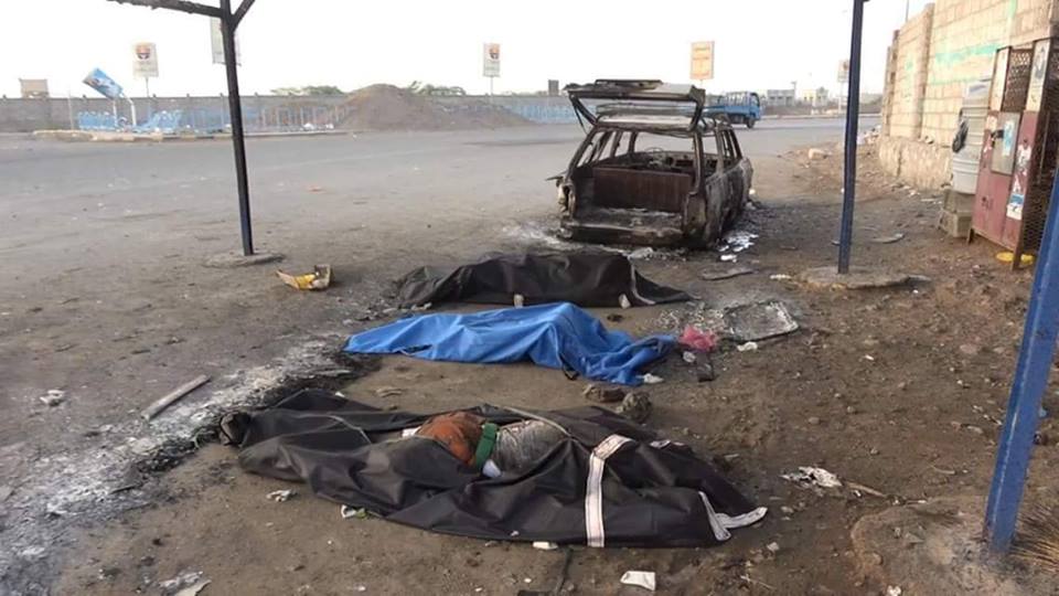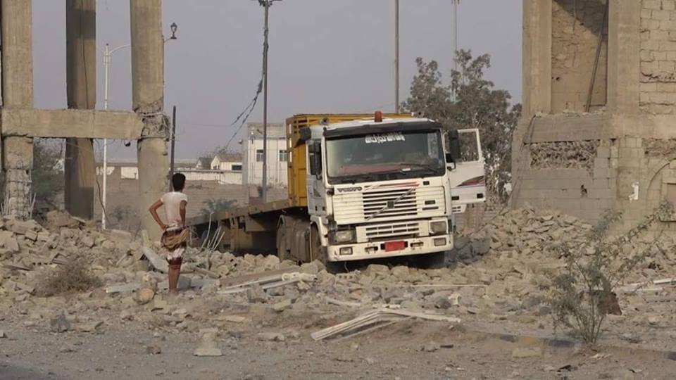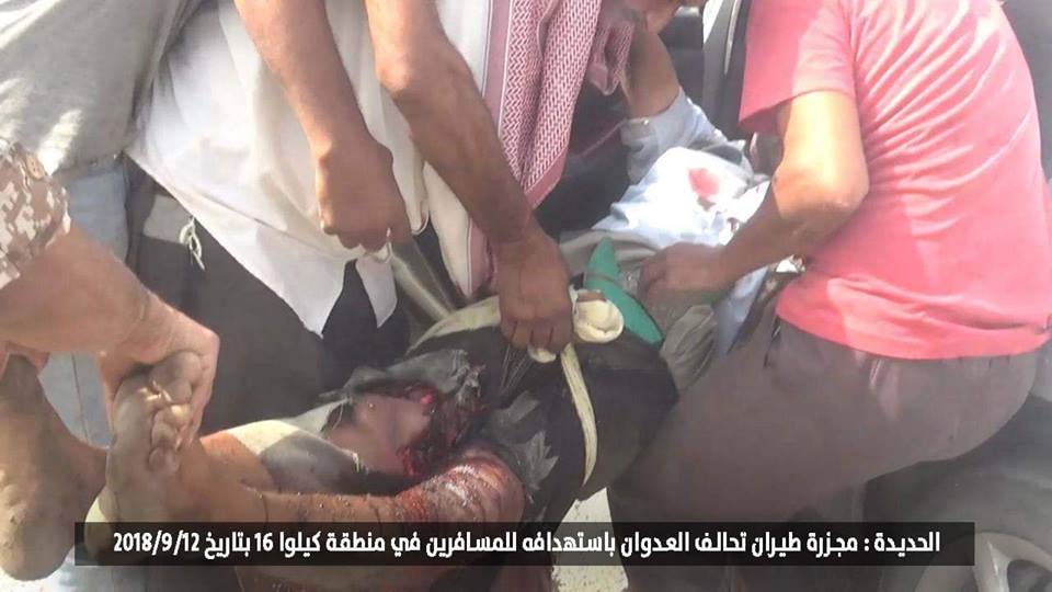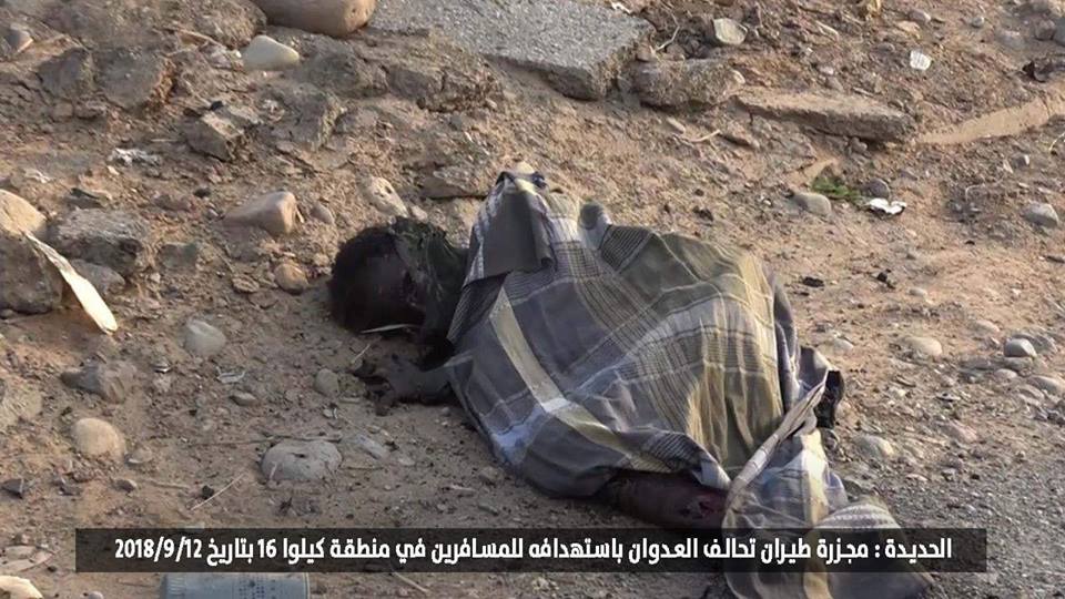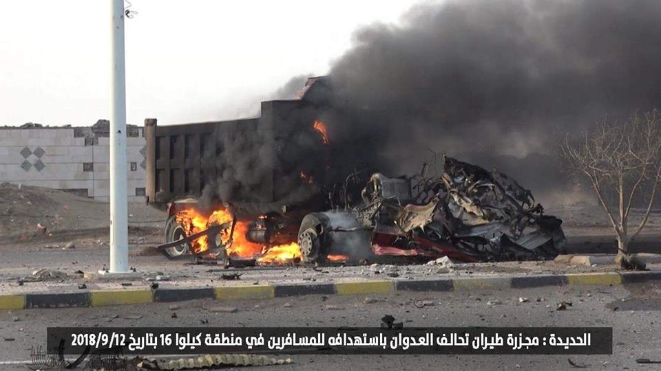 جريمة قصف طيران تحالف العدوان السعودي على سيارات مسافرين و قواطر ومحلات تجارية في خط كيلو 16 الرابط بين الحديدة و صنعاء 12-9-2018