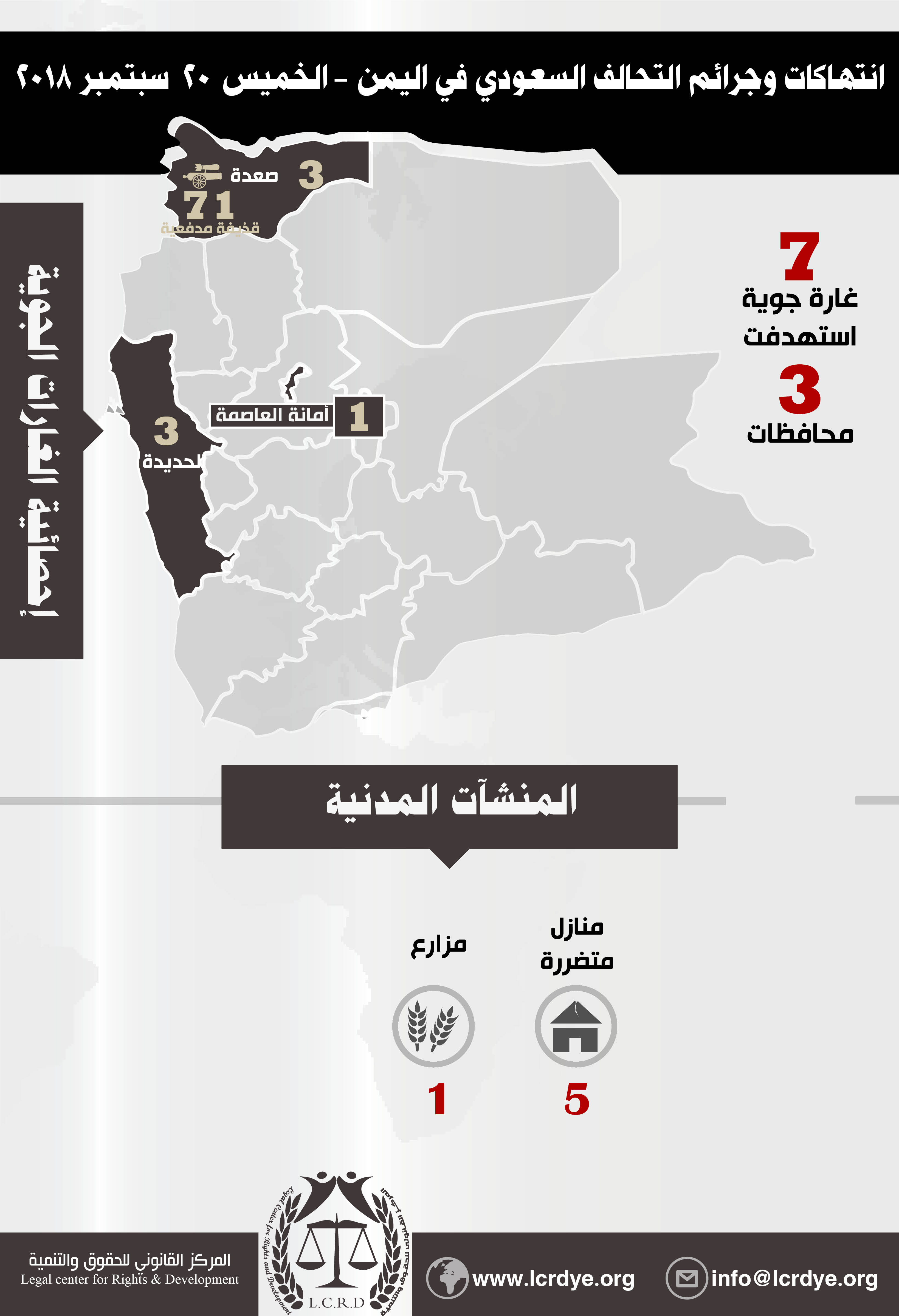 إحصائية أولية لإنتهاكات التحالف السعودي في اليمن 20 سبتمبر 2018 Last updated سبتمبر 25, 2018 للتحميل : https://www.lcrdye.org/wp-content/uploads/2018/09/20-9-2018.pdf استهداف البنى التحتيةاستهداف المنشآت المدنيةالتحالف السعوديالضحايا المدنيين في اليمنالمركز القانوني للحقوق والتنميةاليمنعاصفة الحزمغارات التحالف السعودي على اليمن Share FacebookTwitterGoogle+ReddItWhatsAppPinterestالبريد الإلكتروني