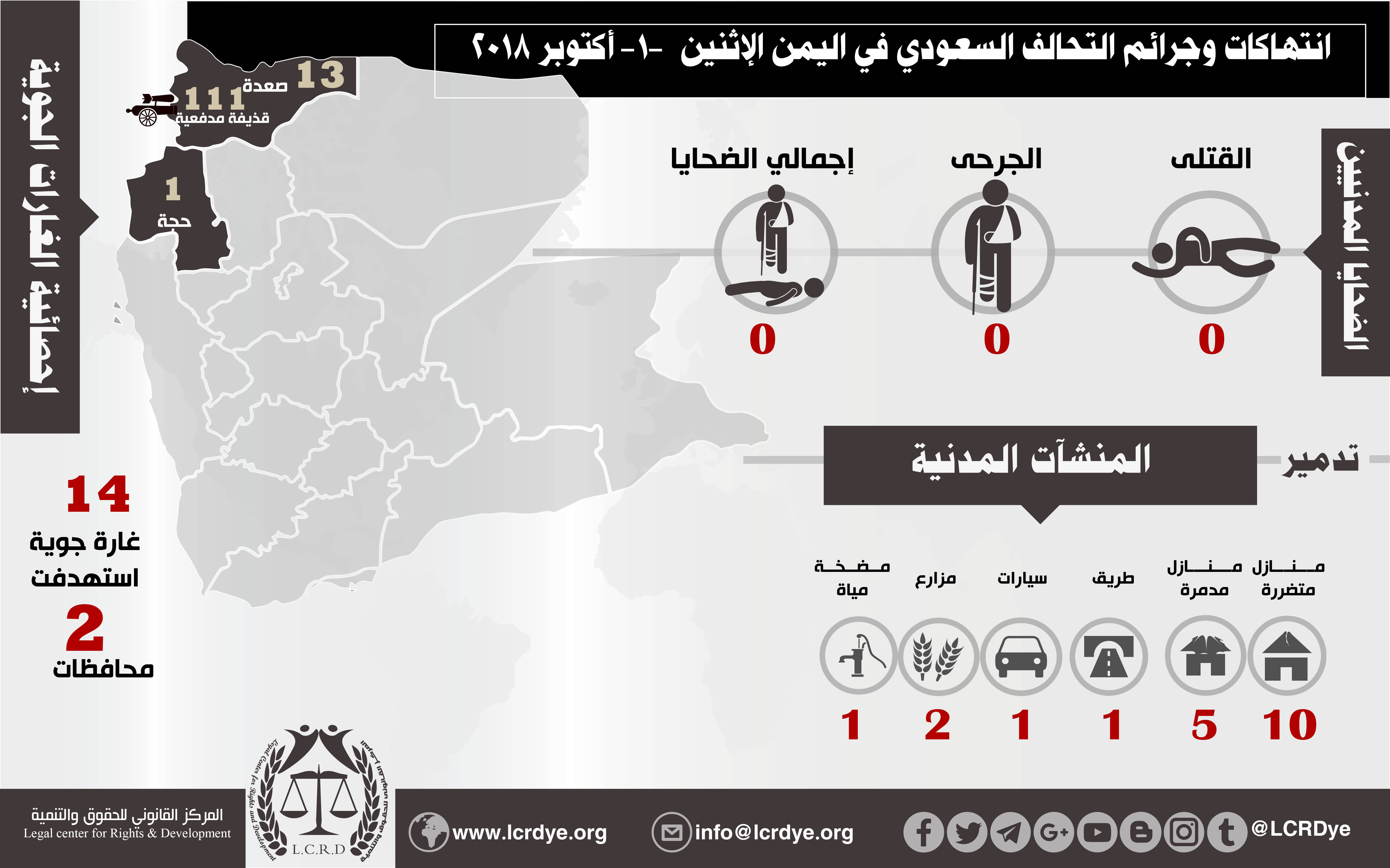 إحصائية أولية لإنتهاكات التحالف السعودي في اليمن 1 أكتوبر 2018 Last updated أكتوبر 3, 2018 للتحميل https://www.lcrdye.org/wp-content/uploads/2018/10/1-10-2018.pdf التحالف السعوديالمركز القانوني للحقوق والتنميةاليمن Share FacebookTwitterGoogle+ReddItWhatsAppPinterestالبريد الإلكتروني