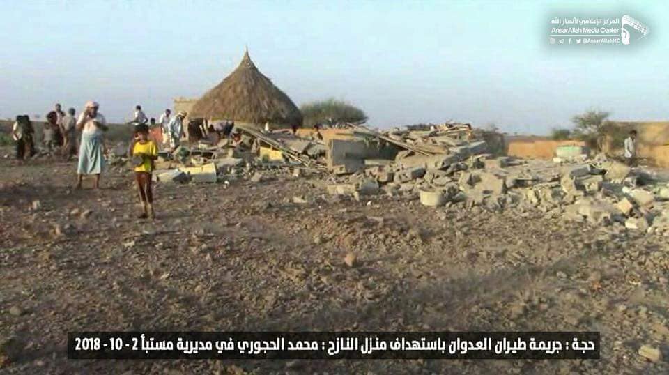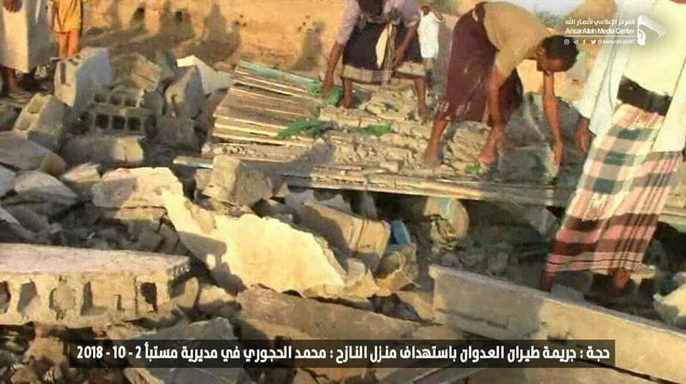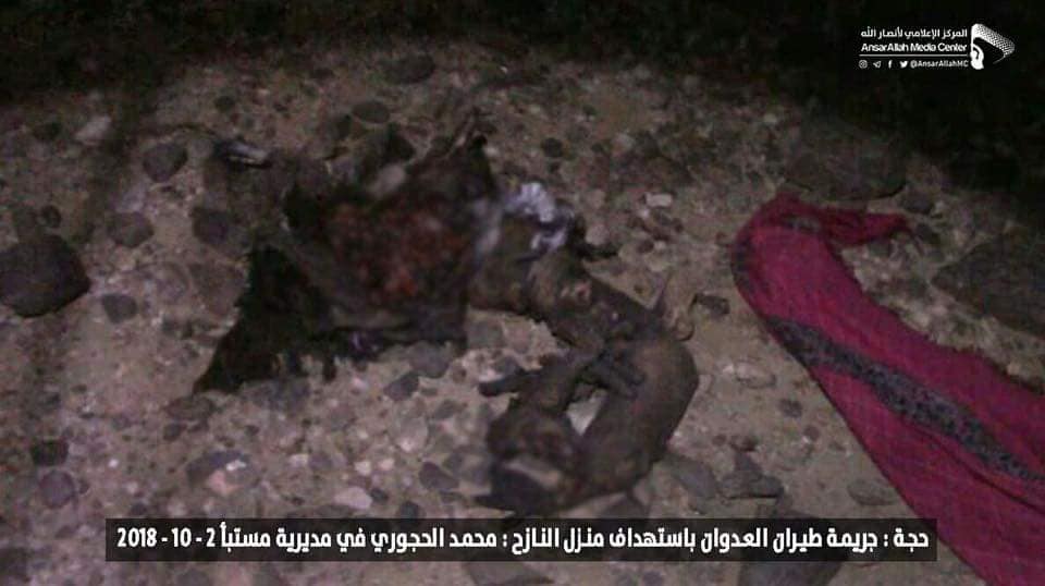واقعة قصف طيران تحالف العدوان السعودي على منزل المواطن النازح محمد الحجوري بمديرية مستبأ في محافظة حجة 2-10-2018م Last updated أكتوبر 6, 2018 استهداف المدنييناستهداف النازحينالتحالف السعوديالضحايا المدنيين في اليمنالمركز القانوني للحقوق والتنميةاليمنجرائم ضد الانسانيةرصد وتوثيق انتهاكات التحالف السعودي Share FacebookTwitterGoogle+ReddItWhatsAppPinterestالبريد الإلكتروني