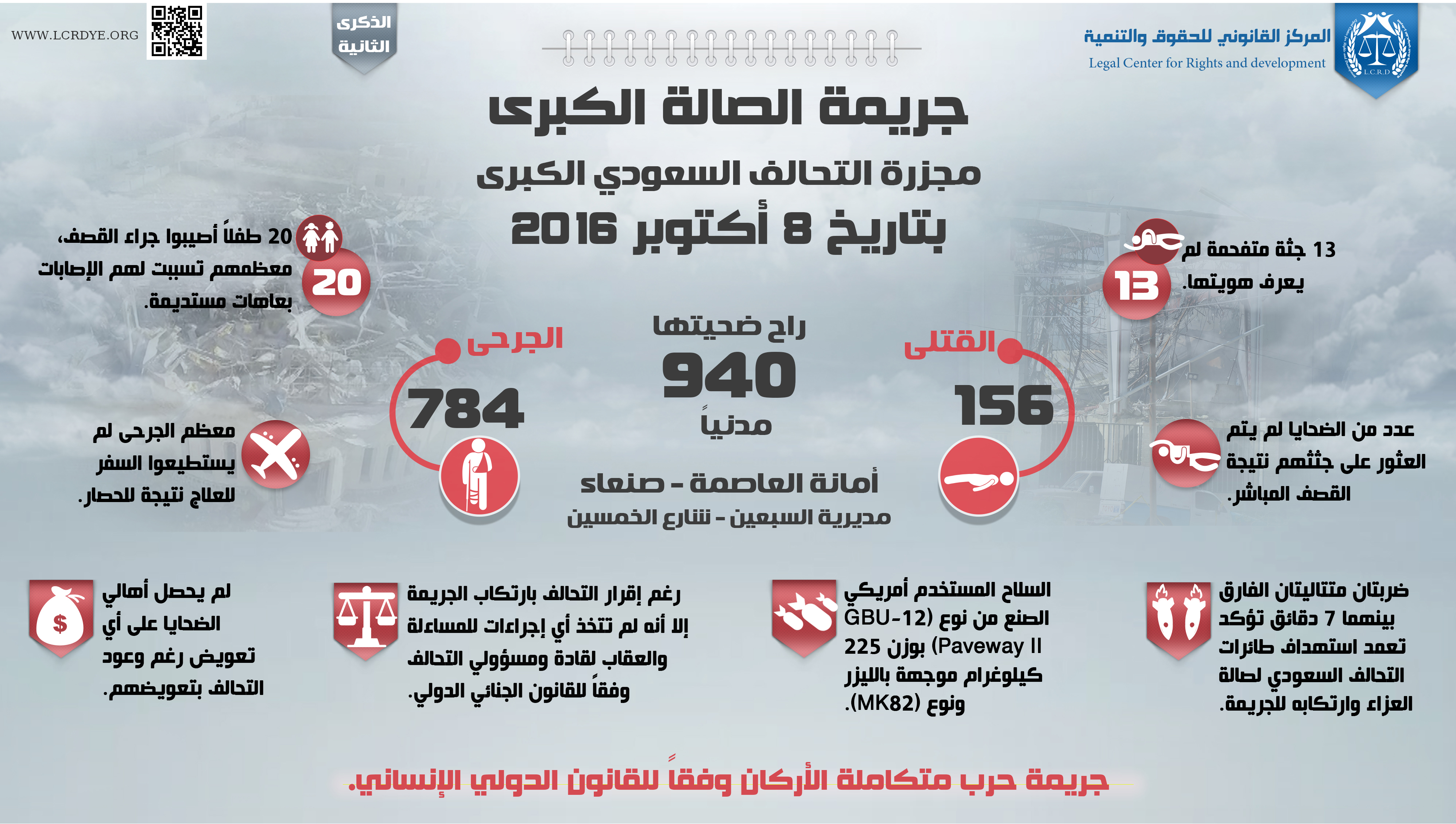 إنفوجرافيك| جريمة الصالة الكبرى التي ارتكبها طيران التحالف السعودي بتاريخ 8 أكتوبر 2016. جريمة حرب متكاملة الأركان وفقاً للقانون الدولي الإنساني.