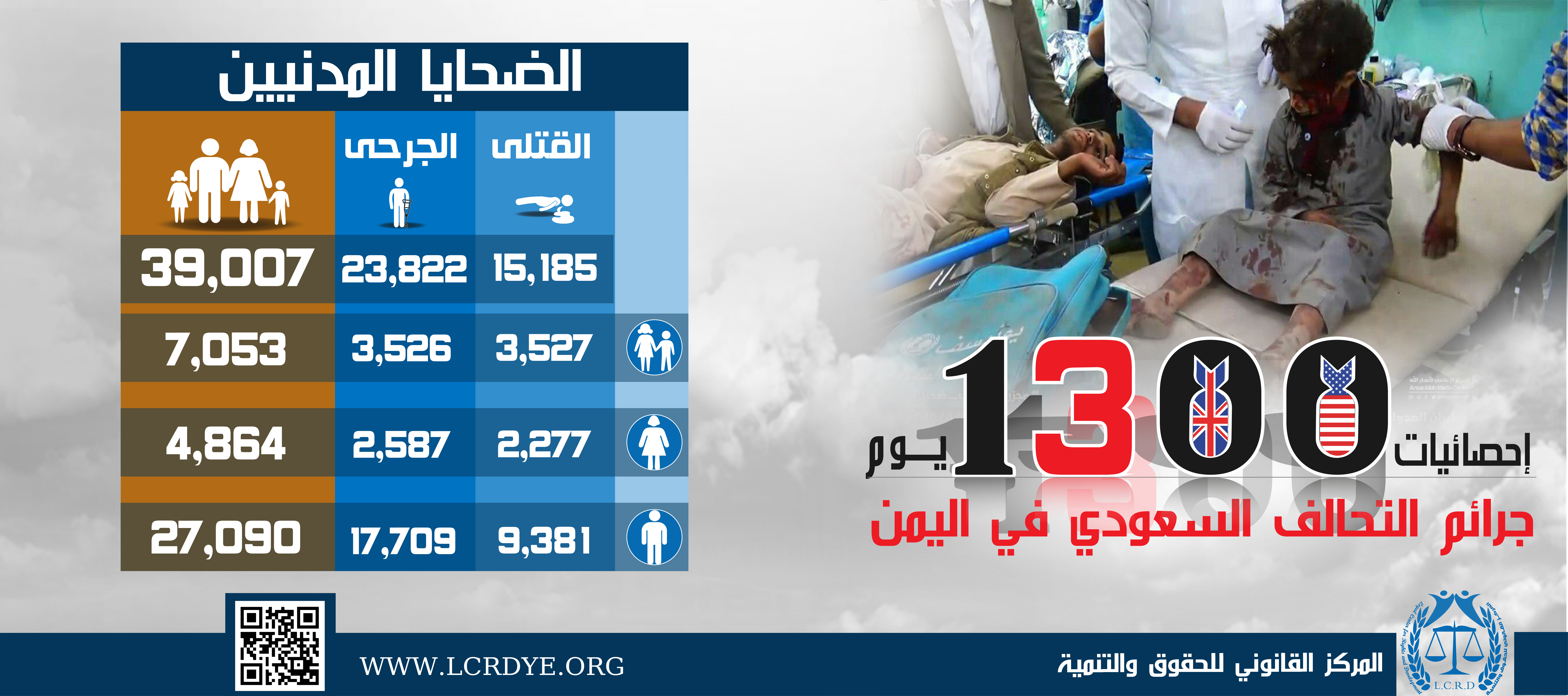 احصائيات الضحايا المدنيين نتيجة الغارات التي تشنها قوات التحالف السعودي خلال 1300 يوم منذ بداية العدوان على اليمن On أكتوبر 19, 2018 Share FacebookTwitterGoogle+ReddItWhatsAppPinterestالبريد الإلكتروني