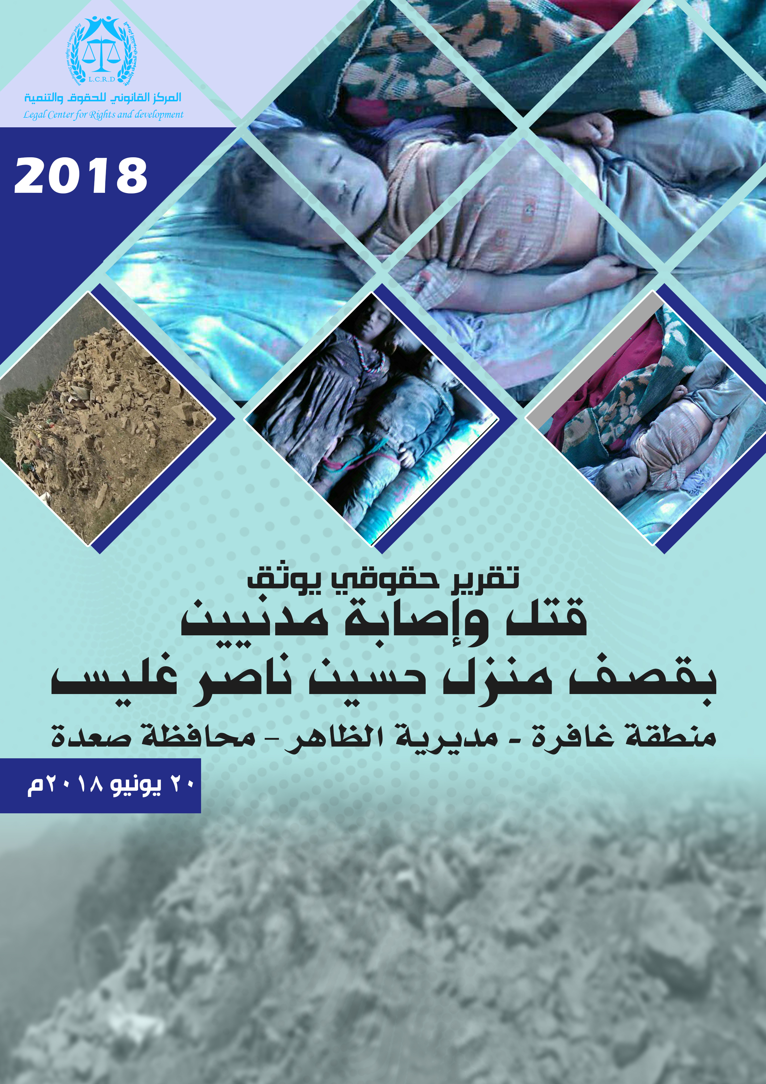 واستمراراً لهذه الجرائم شنت طائرة حربية أو أكثر للتحالف السعودي عند الساعة الـ 12 ظهراً من يوم الأربعاء الموافق20 يونيو 2018م غارتين جويتين على منزل حسين يحيى ناصر غليس الكائن بمنطقة غافرة – مديرية الظاهر الحدودية – محافظة صعدة، دمرت الغارة المنزل ومنزلان مجاوران لأخية ووالدته خلفت (4) مدنيين امرأة وثلاثة أطفال قتلى وجرحت (9) أخرين بعضاً منهم جراحهم خطرة، نظراً لحالتهم المادية الصعبة وعدم توافر مراكز صحية بالمنطقة النائية أو المناطق المجاورة ووعورة الطريق إضافة إلى التحليق المكثف لطيران التحالف السعودي والمستمر في أجواء تلك المناطق، لم يستطيع أحد نقل المصابين الى المستشفيات لتقديم العناية الطبية لهم مما اضطر شخص من جيرانهم بالتطوع لمداواة الجرحى بأدوات المجارحة البسيطة التي يمتلكها بعد أن تم وضع المصابين تحت ظل أحد الأشجار جوار منزلهم المهدم والذين ما يزالون تحت الشجرة لا يجدون مأوى أو مكان آمن يتم نقلهم إليه ومعالجتهم.