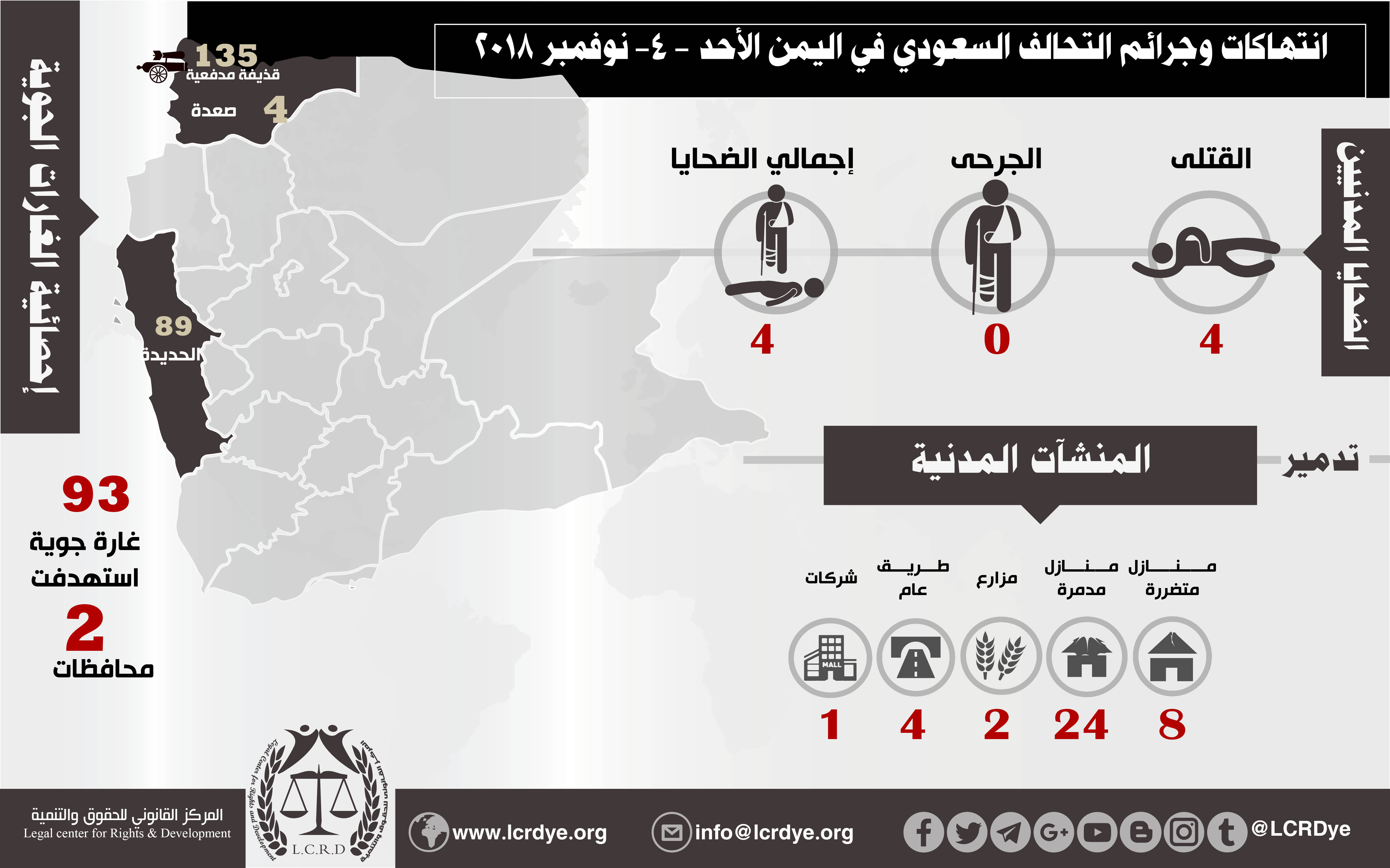 إحصائية أولية لإنتهاكات التحالف السعودي في اليمن 4 نوفمبر 2018 Last updated نوفمبر 5, 2018 للتحميل : استهداف البنى التحتيةاستهداف المدنييناستهداف المنشآت الاقتصاديةاستهداف المنشآت المدنيةالتحالف السعوديالمركز القانوني للحقوق والتنميةاليمنعاصفة الحزم Share FacebookTwitterGoogle+ReddItWhatsAppPinterestالبريد الإلكتروني
