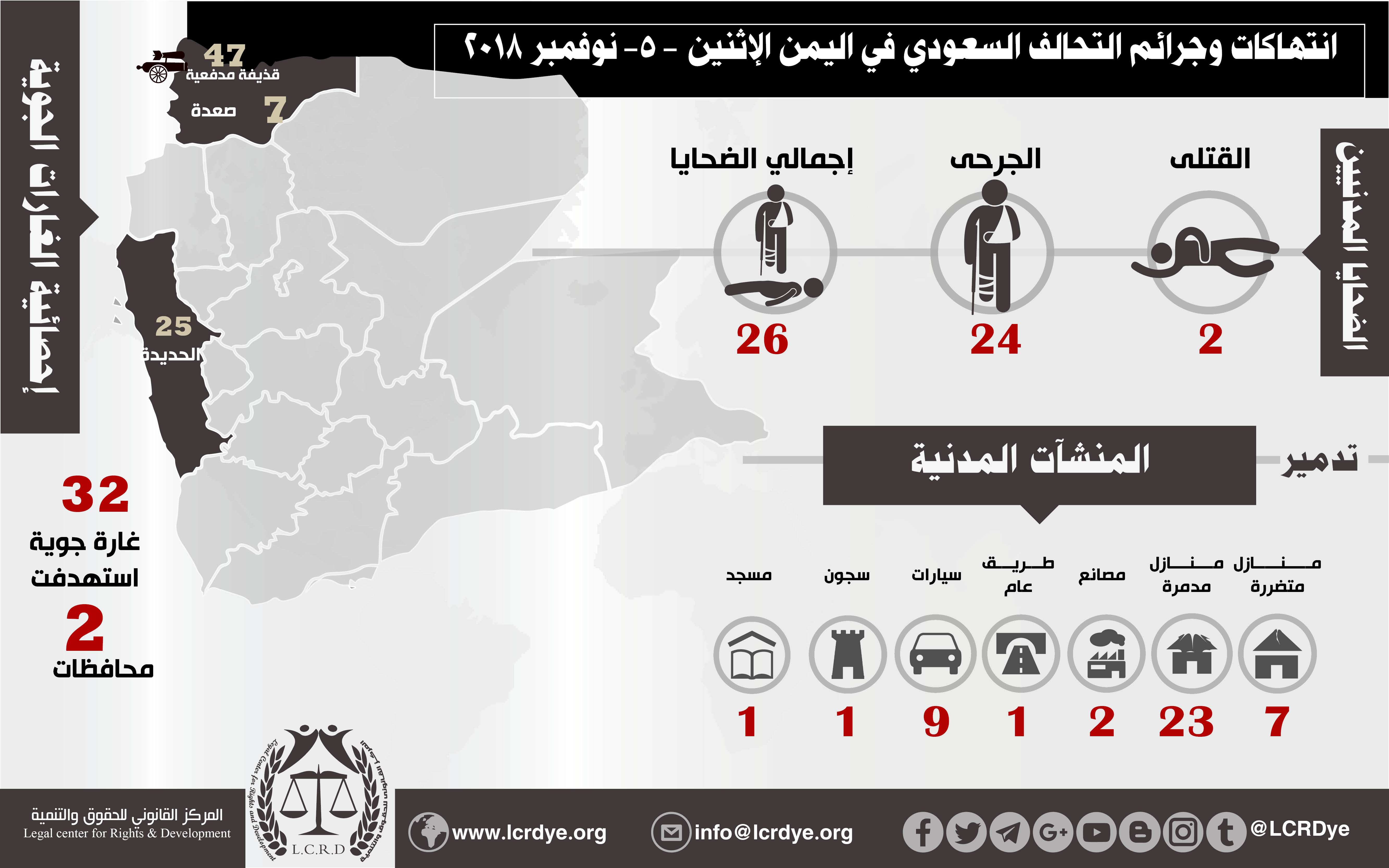 إحصائية أولية لإنتهاكات التحالف السعودي في اليمن 5 نوفمبر 2018 Last updated نوفمبر 7, 2018 للتحميل : استهداف البنى التحتيةاستهداف المدنيينالتحالف السعوديالضحايا المدنيين في اليمنالمركز القانوني للحقوق والتنميةاليمنعاصفة الحزمغارات التحالف السعودي على اليمن Share FacebookTwitterGoogle+ReddItWhatsAppPinterestالبريد الإلكتروني