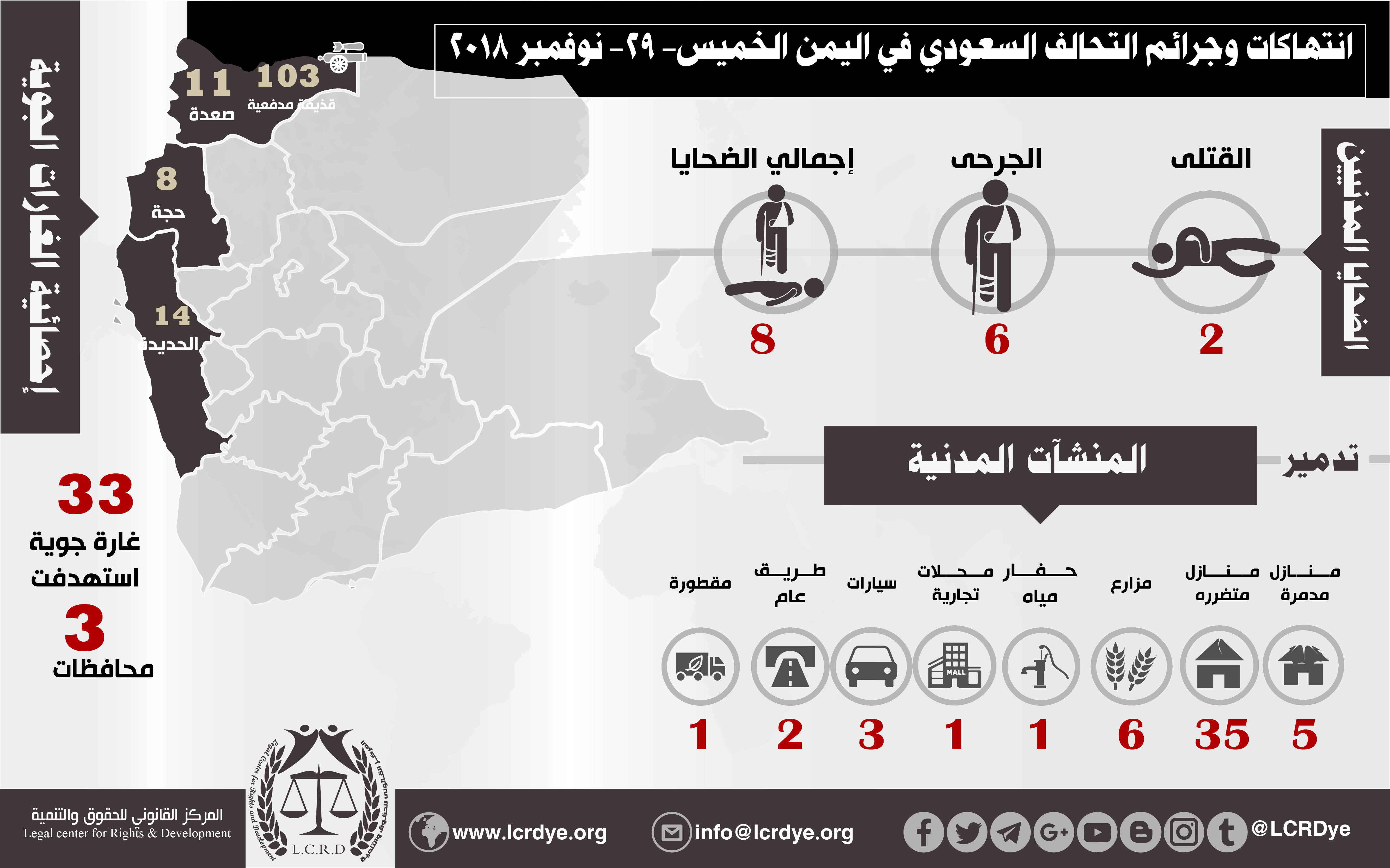 إحصائية أولية لإنتهاكات التحالف السعودي في اليمن 29 نوفمبر 2018 Last updated ديسمبر 4, 2018 للتحميل : استهداف الاحياء المدنيةالتحالف السعوديالضحايا المدنيين في اليمنالمركز القانوني للحقوق والتنميةاليمنرصد وتوثيق انتهاكات التحالف السعوديعاصفة الحزمغارات التحالف السعودي على اليمن Share FacebookTwitterGoogle+ReddItWhatsAppPinterestالبريد الإلكتروني