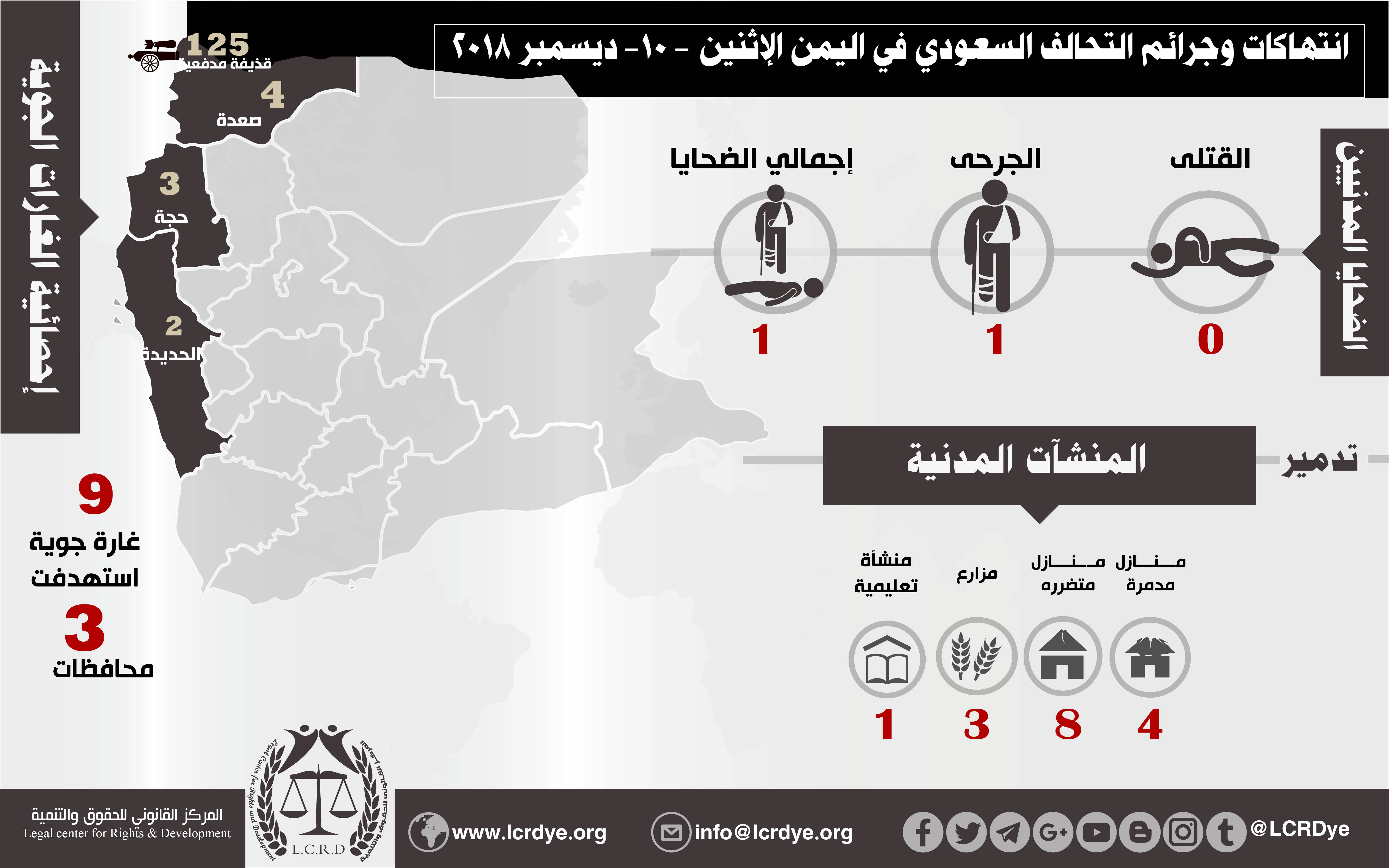 إحصائية أولية لإنتهاكات التحالف السعودي في اليمن 10 ديسمبر 2018 Last updated يناير 9, 2019 للتحميل التحالف السعوديالمركز القانوني للحقوق والتنميةاليمن Share FacebookTwitterGoogle+ReddItWhatsAppPinterestالبريد الإلكتروني