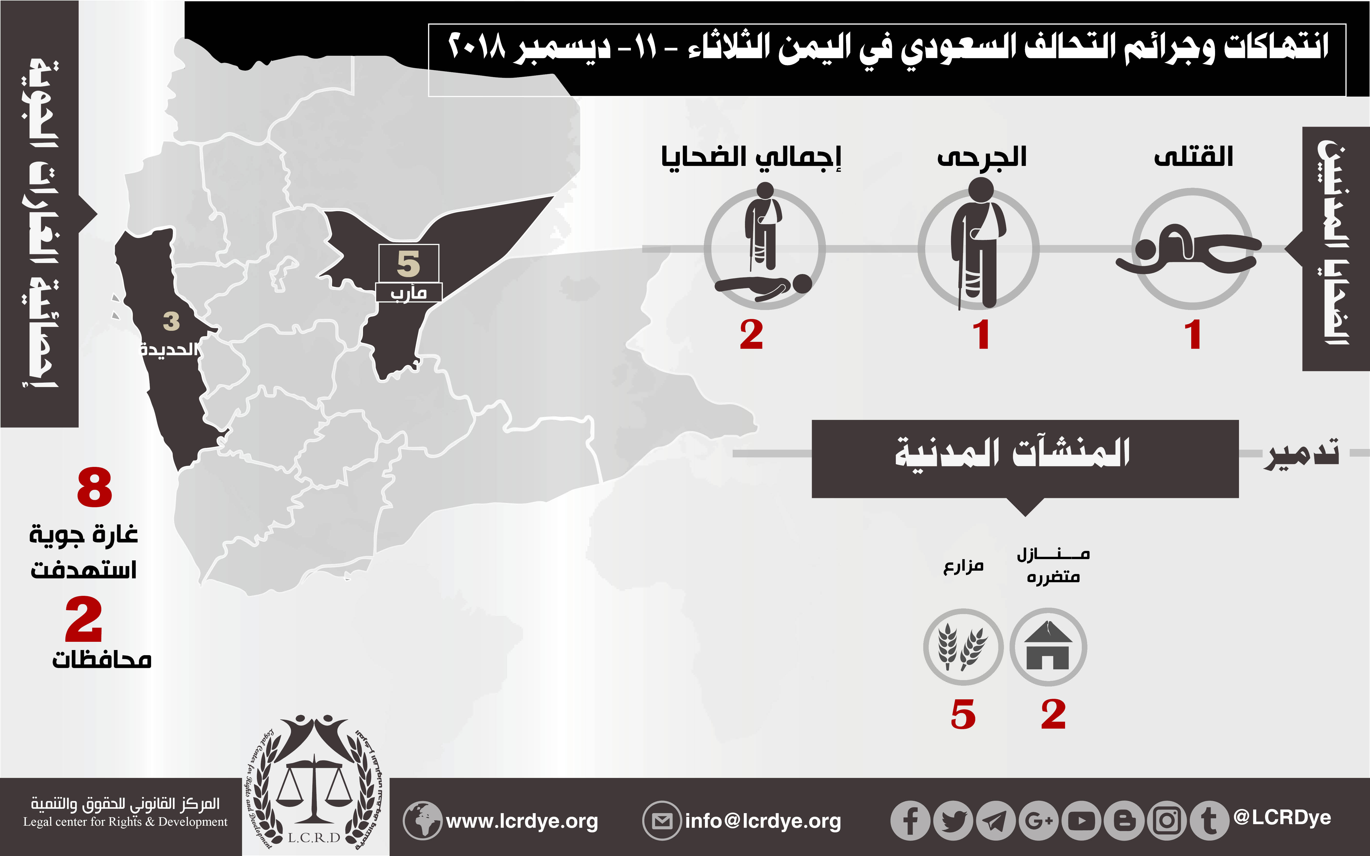 إحصائية أولية لإنتهاكات التحالف السعودي في اليمن 11 ديسمبر 2018 Last updated يناير 9, 2019 للتحميل التحالف السعوديالمركز القانوني للحقوق والتنميةاليمنغارات التحالف السعودي على اليمن Share FacebookTwitterGoogle+ReddItWhatsAppPinterestالبريد الإلكتروني
