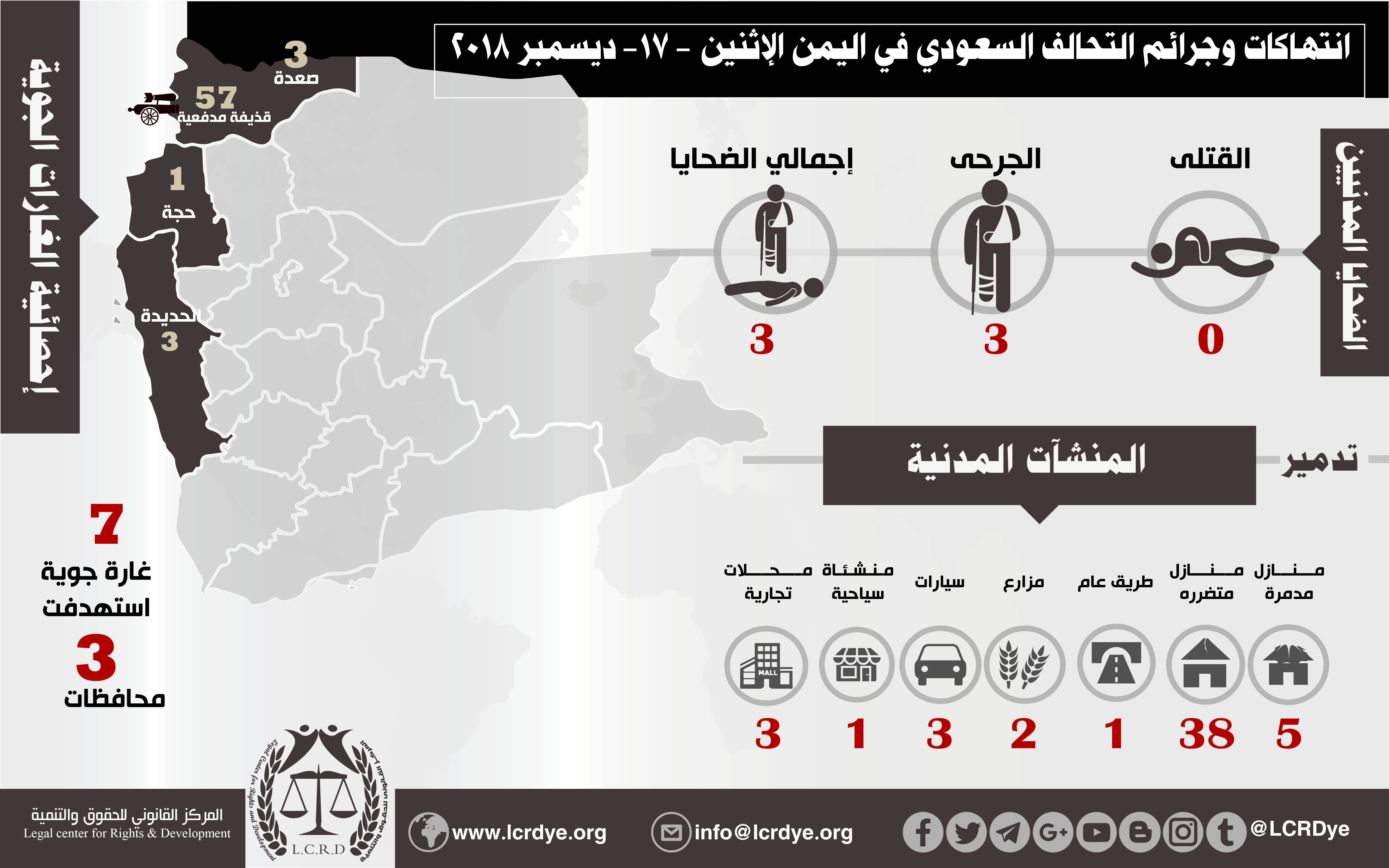 إحصائية أولية لإنتهاكات التحالف السعودي في اليمن17 ديسمبر 2018 Last updated يناير 9, 2019 للتحميل : استهداف البنى التحتيةاستهداف المدنيينالضحايا المدنيين في اليمنالمركز القانوني للحقوق والتنميةاليمنجرائم ضد الانسانيةرصد وتوثيق انتهاكات التحالف السعوديعاصفة الحزم Share FacebookTwitterGoogle+ReddItWhatsAppPinterestالبريد الإلكتروني