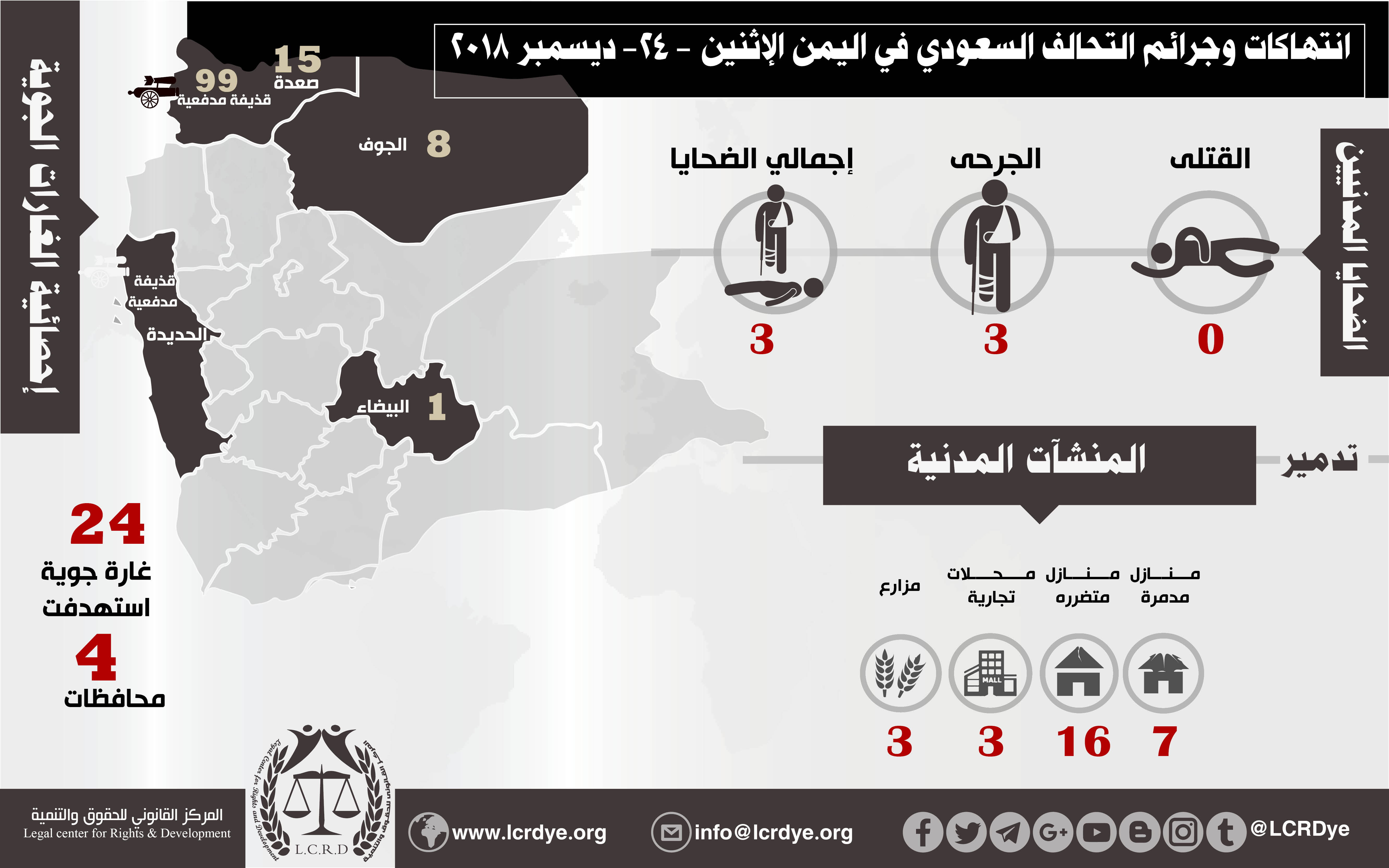 إحصائية أولية لإنتهاكات التحالف السعودي في اليمن 24 ديسمبر 2018 Last updated يناير 13, 2019 للتحميل: استهداف المنشآت الاقتصاديةالتحالف السعوديالمركز القانوني للحقوق والتنميةاليمنجرائم ضد الانسانيةرصد وتوثيق انتهاكات التحالف السعوديعاصفة الحزمغارات التحالف السعودي على اليمن Share FacebookTwitterGoogle+ReddItWhatsAppPinterestالبريد الإلكتروني