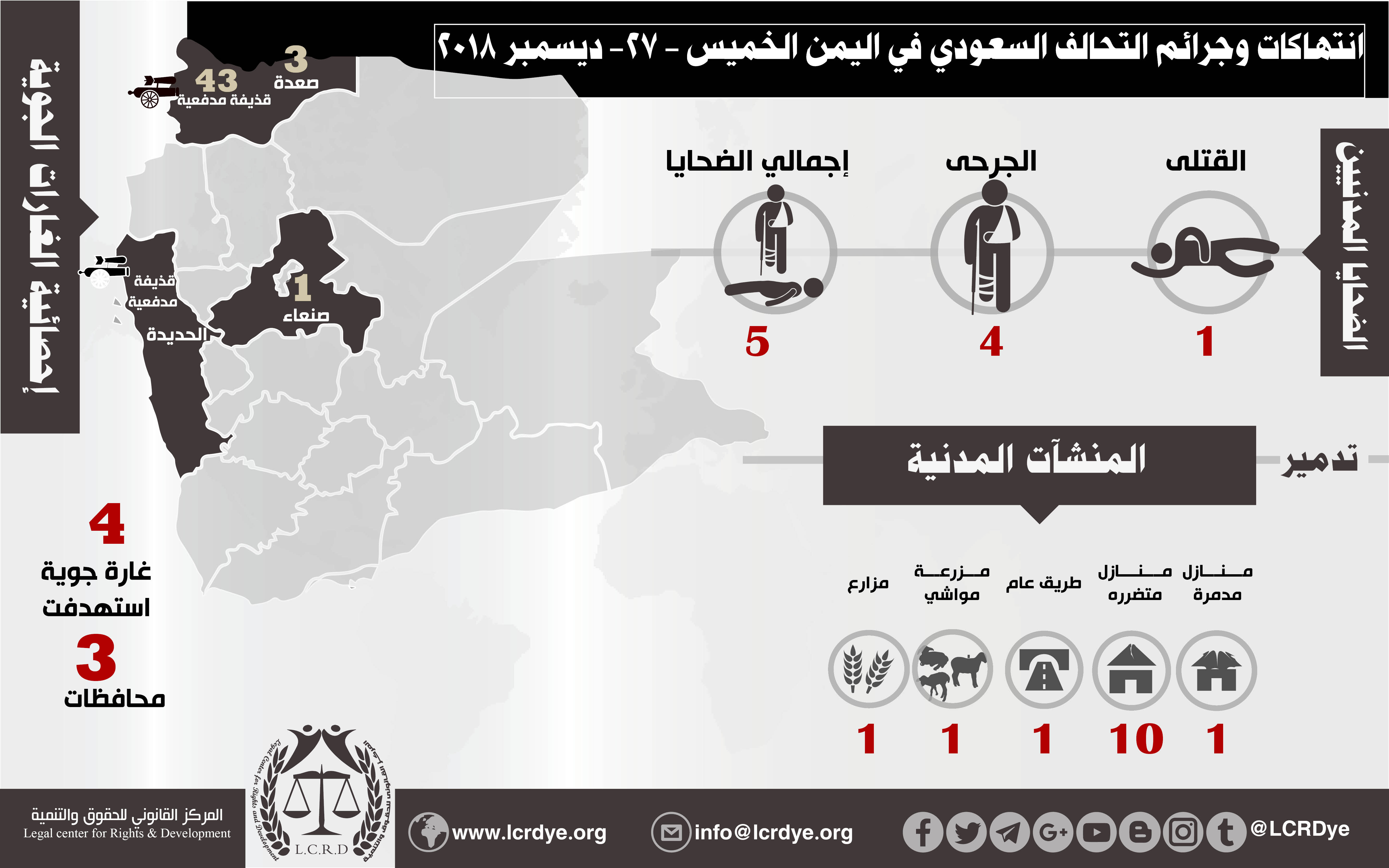 إحصائية أولية لإنتهاكات التحالف السعودي في اليمن 27 ديسمبر 2018 Last updated يناير 13, 2019 للتحميل : استهداف البنى التحتيةاستهداف المدنيينالتحالف السعوديالضحايا المدنيين في اليمنالمركز القانوني للحقوق والتنميةاليمنرصد وتوثيق انتهاكات التحالف السعوديعاصفة الحزم Share FacebookTwitterGoogle+ReddItWhatsAppPinterestالبريد الإلكتروني