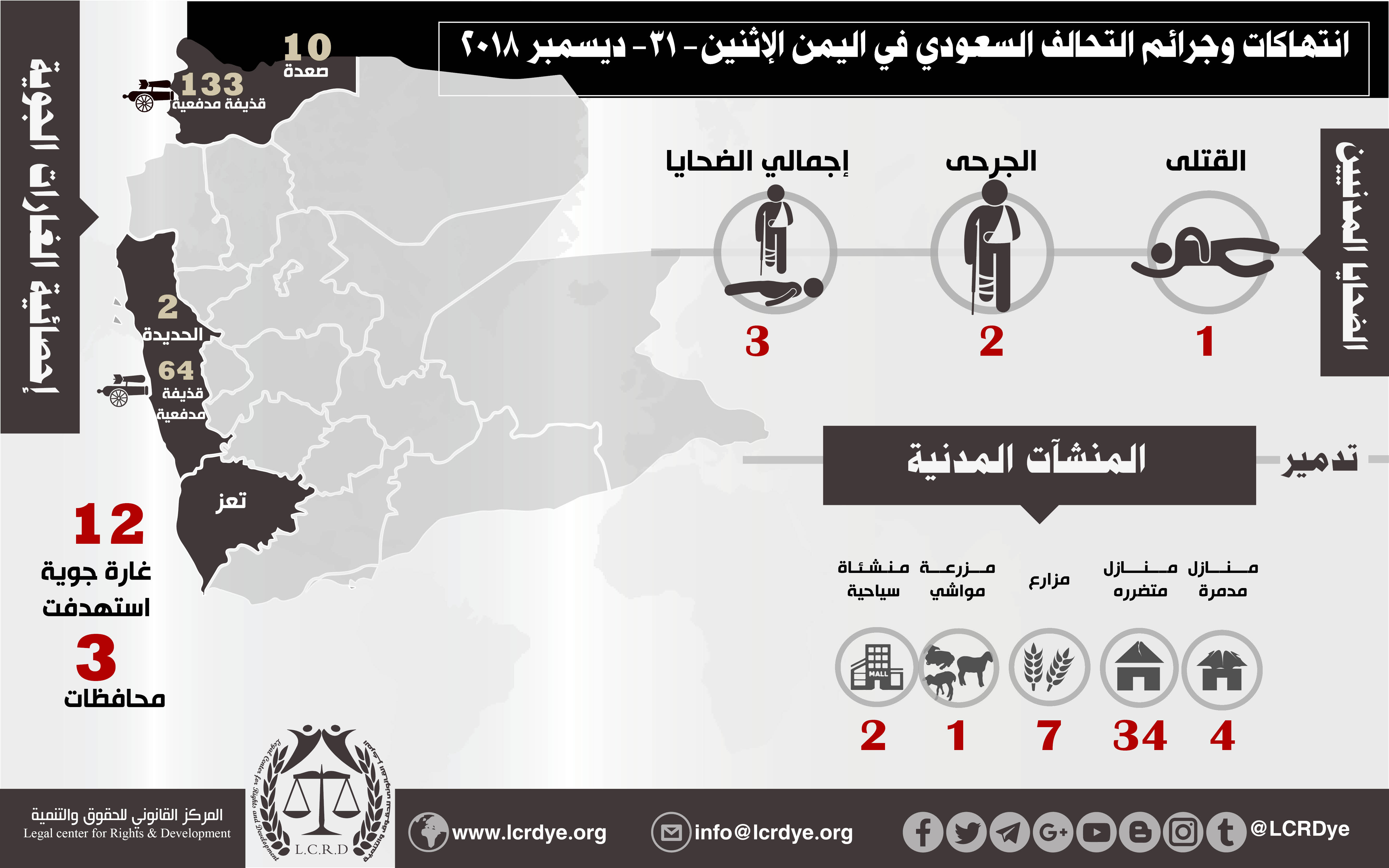 إحصائية أولية لإنتهاكات التحالف السعودي في اليمن 31 ديسمبر 2018 Last updated يناير 13, 2019 للتحميل : استهداف المدنييناستهداف المنشآت المدنيةالتحالف السعوديالضحايا المدنيين في اليمنالمركز القانوني للحقوق والتنميةاليمنرصد وتوثيق انتهاكات التحالف السعوديعاصفة الحزم Share FacebookTwitterGoogle+ReddItWhatsAppPinterestالبريد الإلكتروني