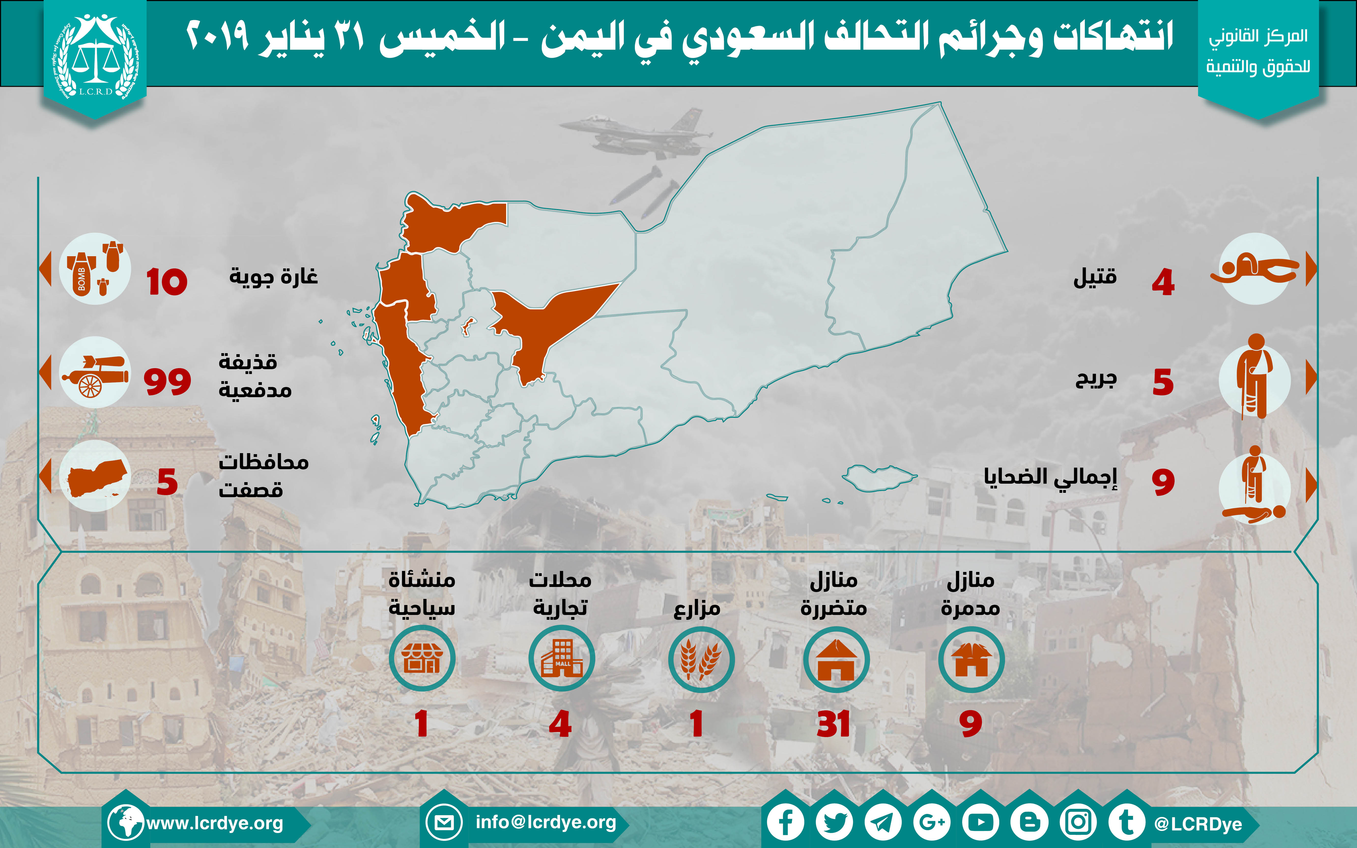 إحصائية أولية لإنتهاكات التحالف السعودي في اليمن 31 يناير 2019