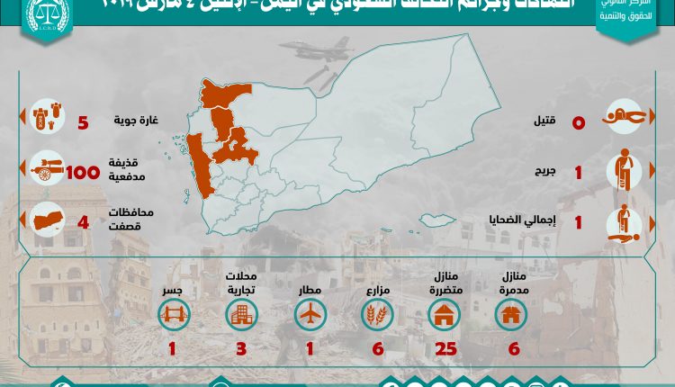 إحصائية أولية لإنتهاكات التحالف السعودي في اليمن 4 مارس 2019 Last updated مارس 5, 2019 للتحميل : استهداف البنى التحتيةاستهداف المدنييناستهداف المنشآت الاقتصاديةالضحايا المدنيين في اليمنالمركز القانوني للحقوق والتنميةاليمنرصد وتوثيق انتهاكات التحالف السعوديعاصفة الحزم Share FacebookTwitterGoogle+ReddItWhatsAppPinterestالبريد الإلكتروني