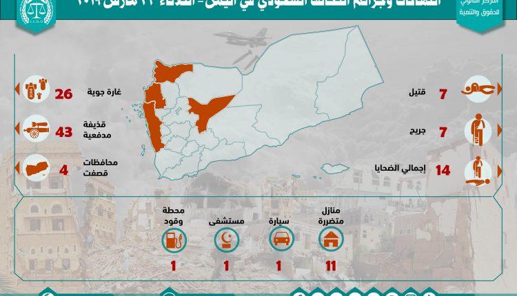 إحصائية أولية لإنتهاكات التحالف السعودي في اليمن 26 مارس 2019 Last updated مارس 27, 2019 للتحميل : استهداف البنى التحتيةاستهداف المدنييناستهداف المنشآت الاقتصاديةالتحالف السعوديالضحايا المدنيين في اليمنالمركز القانوني للحقوق والتنميةاليمنجرائم ضد الانسانية Share FacebookTwitterGoogle+ReddItWhatsAppPinterestالبريد الإلكتروني