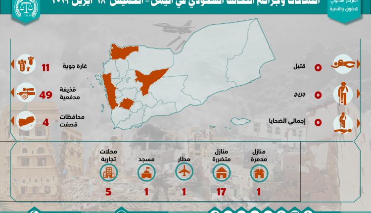 إحصائية أولية لإنتهاكات التحالف السعودي في اليمن 18 أبريل 2019 Last updated أبريل 22, 2019 للتحميل : استهداف البنى التحتيةاستهداف المدنييناستهداف المنشآت الاقتصاديةاستهداف المنشآت المدنيةالمركز القانوني للحقوق والتنميةاليمنرصد وتوثيق انتهاكات التحالف السعوديعاصفة الحزم Share FacebookTwitterGoogle+ReddItWhatsAppPinterestالبريد الإلكتروني