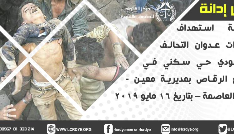 وقف المركز القانوني للحقوق والتنمية أمام الجريمة المروعة التي ارتكبها طيران التحالف السعودي بقصفه حي سكني بشارع الرقاص صباح اليوم الخميس الموافق 16 مايو 2019م بمديرية معين – أمانة العاصمة، حيث أسقط قنبلة جوية على منزل المواطن/ أحمد الحبيشي وعمارتين سكنية مجاورة يسكن في إحداها أسرة الإعلامي عبدالله صبري، مما تسببت في مقتل ما لا يقل عن (6) مدنيين بينهم (5) أطفال وجرح ما لا يقل عن (72) مدنياً بينهم (32) طفلاً و(16) امرأة كحصيلة أولية ولازال عدد الضحايا في ارتفاع حسب إفادات مصادر طبية، كما دمرت الغارة الوحشية وألحقت أضراراً بالغة بعشرات المنازل المدنية والمحال التجارية حجم الدمار الذي خلفته الغارة الجوية بالحي المستهدف مهول للغاية ويفوق وصفه.
