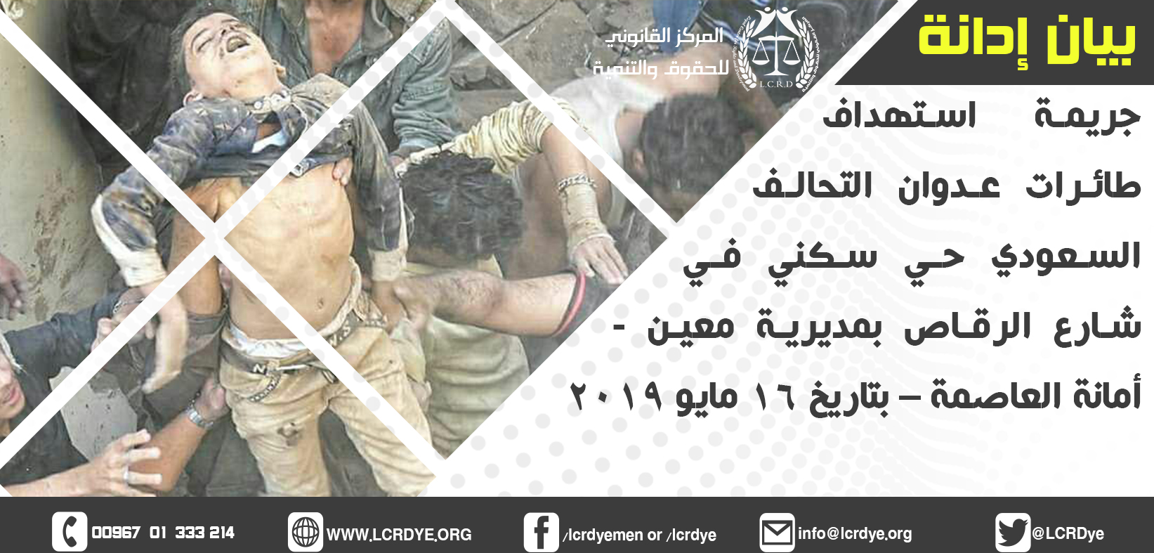 بيان إدانة| جريمة استهداف طائرات عدوان التحالف السعودي حي سكني في شارع الرقاص بمديرية معين – أمانة العاصمة – بتاريخ 16 مايو 2019.