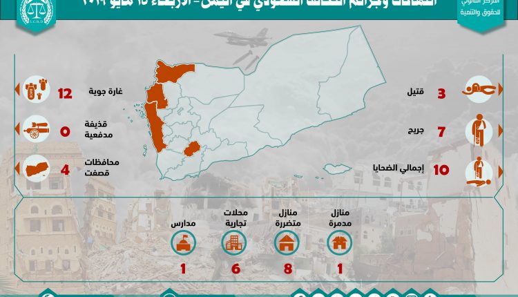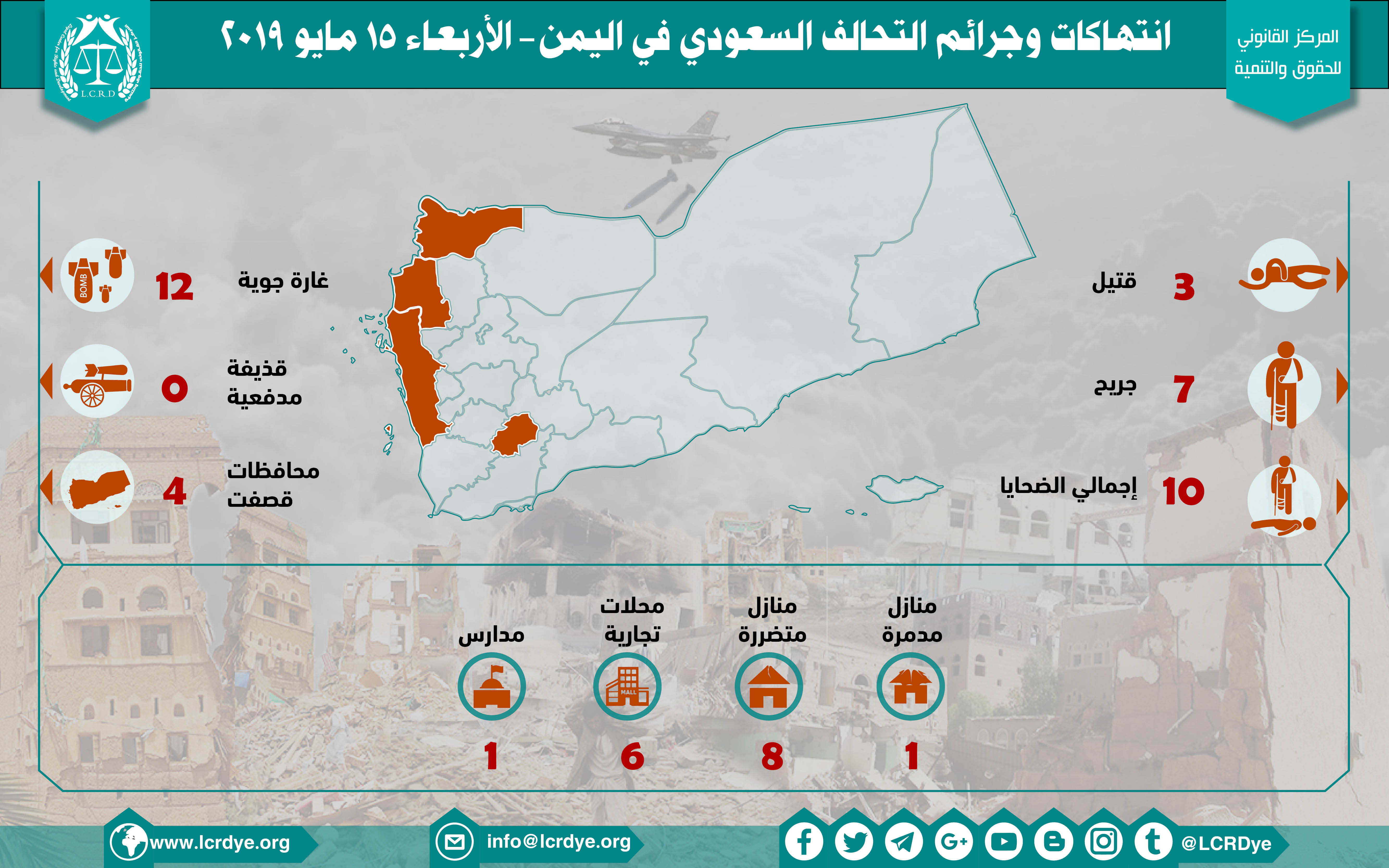 إحصائية أولية لإنتهاكات التحالف السعودي في اليمن 15 مايو 2019 Last updated مايو 19, 2019 للتحميل : استهداف البنى التحتيةاستهداف المدنييناستهداف المنشآت المدنيةالتحالف السعوديالضحايا المدنيين في اليمنالمركز القانوني للحقوق والتنميةاليمنرصد وتوثيق انتهاكات التحالف السعودي Share FacebookTwitterGoogle+ReddItWhatsAppPinterestالبريد الإلكتروني