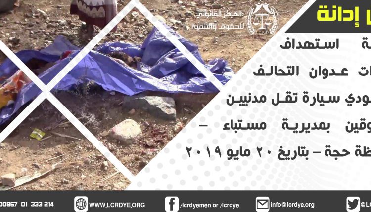بيان إدانة| جريمة استهداف طائرات عدوان التحالف السعودي سيارة تقل مدنيين متسوقين بمديرية مستباء – محافظة حجة – بتاريخ 20 مايو 2019.