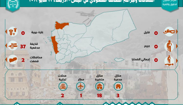 إحصائية أولية لإنتهاكات التحالف السعودي في اليمن 22 مايو 2019 Last updated مايو 25, 2019 للتحميل : استهداف البنى التحتيةاستهداف المدنييناستهداف المنشآت الاقتصاديةاستهداف المنشآت المدنيةالتحالف السعوديالضحايا المدنيين في اليمنالمركز القانوني للحقوق والتنميةاليمن Share FacebookTwitterGoogle+ReddItWhatsAppPinterestالبريد الإلكتروني