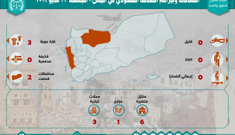 إحصائية أولية لإنتهاكات التحالف السعودي في اليمن 31 مايو 2019 Last updated يونيو 17, 2019 للتحميل : استهداف البنى التحتيةاستهداف المدنييناستهداف المنشآت الاقتصاديةاستهداف المنشآت المدنيةالضحايا المدنيين في اليمنالمركز القانوني للحقوق والتنميةاليمنرصد وتوثيق انتهاكات التحالف السعودي Share FacebookTwitterGoogle+ReddItWhatsAppPinterestالبريد الإلكتروني