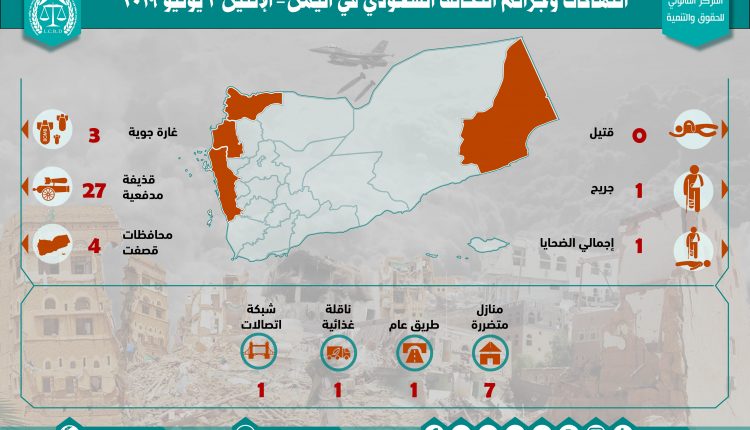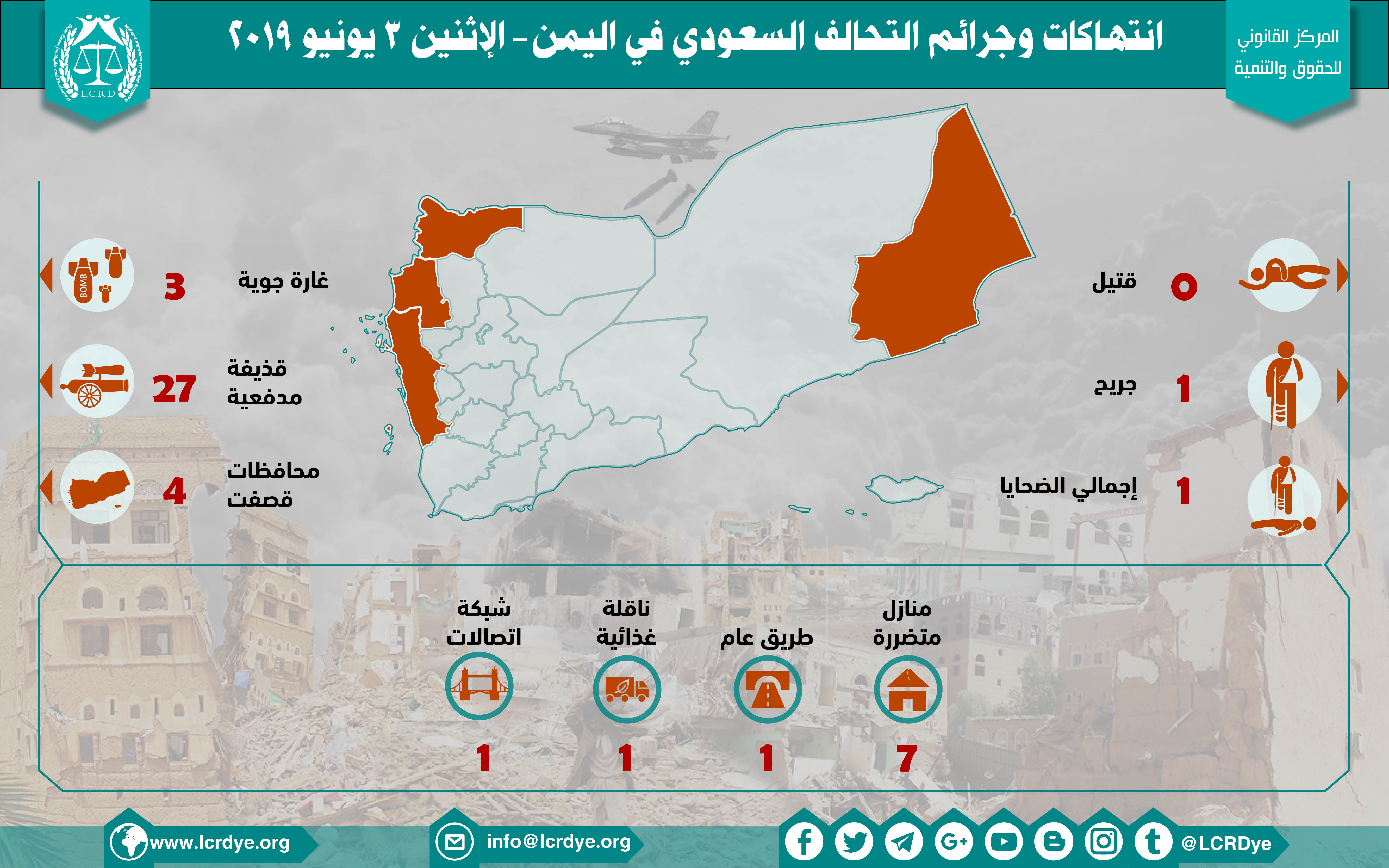 إحصائية أولية لإنتهاكات التحالف السعودي في اليمن 3 يونيو 2019 Last updated يونيو 17, 2019 للتحميل : استهداف البنى التحتيةاستهداف المدنييناستهداف المنشآت الاقتصاديةالتحالف السعوديالضحايا المدنيين في اليمنالمركز القانوني للحقوق والتنميةرصد وتوثيق انتهاكات التحالف السعوديعاصفة الحزم Share FacebookTwitterGoogle+ReddItWhatsAppPinterestالبريد الإلكتروني