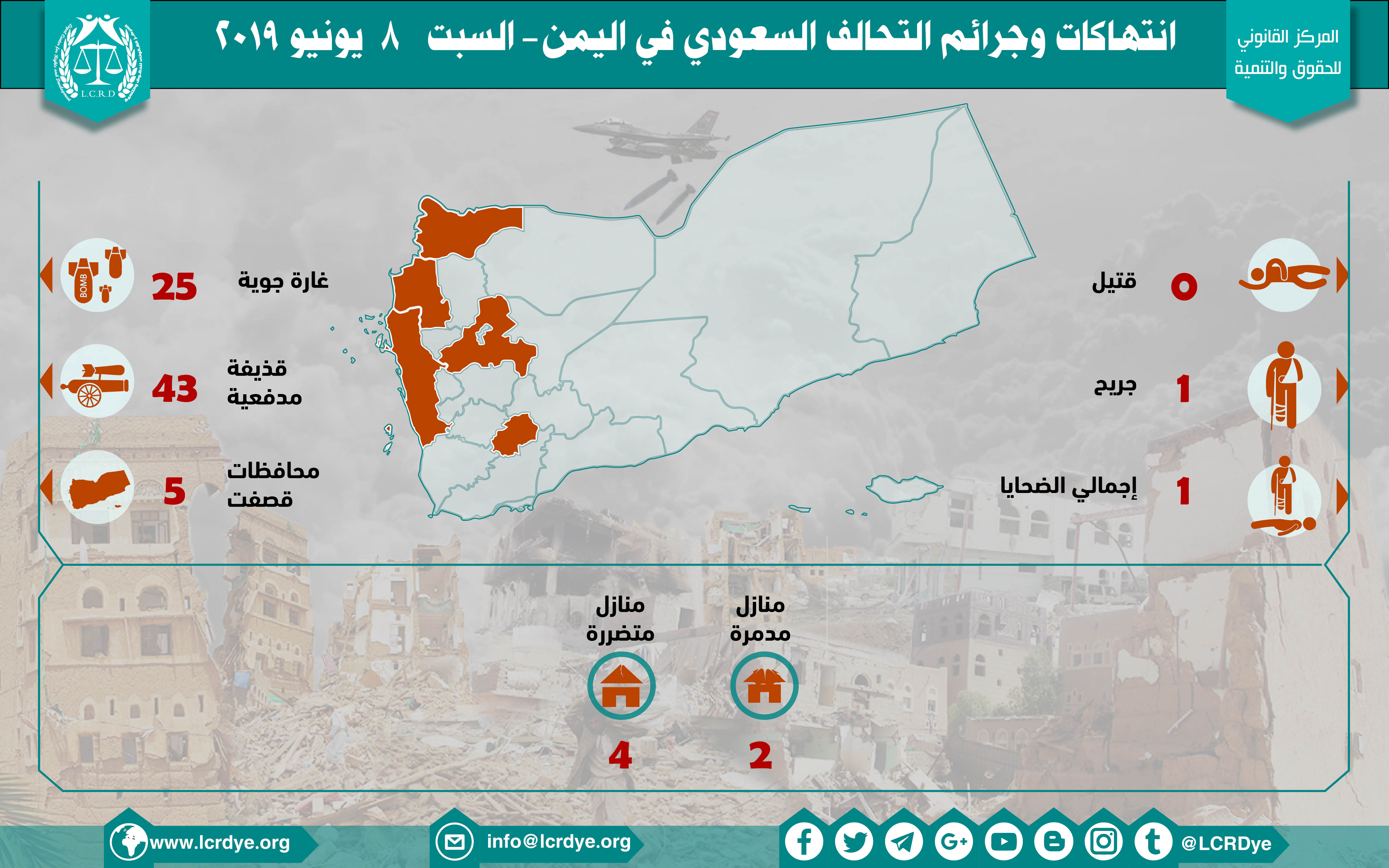 إحصائية أولية لإنتهاكات التحالف السعودي في اليمن 8 يونيو 2019 Last updated يونيو 17, 2019 للتحميل : استهداف المنشآت المدنيةالتحالف السعوديالضحايا المدنيين في اليمنالمركز القانوني للحقوق والتنميةرصد وتوثيق انتهاكات التحالف السعوديعاصفة الحزمغارات التحالف السعودي على اليمن Share FacebookTwitterGoogle+ReddItWhatsAppPinterestالبريد الإلكتروني