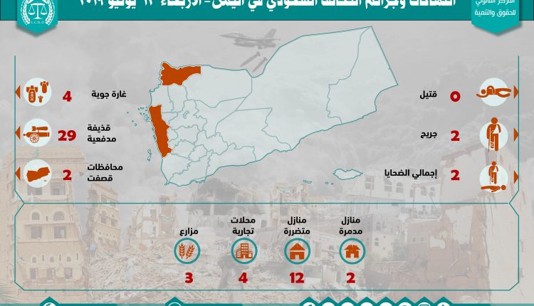 إحصائية أولية لإنتهاكات التحالف السعودي في اليمن 12 يونيو 2019 Last updated يونيو 17, 2019 للتحميل : التحالف السعوديالمركز القانوني للحقوق والتنميةاليمنرصد وتوثيق انتهاكات التحالف السعوديعاصفة الحزمغارات التحالف السعودي على اليمن Share FacebookTwitterGoogle+ReddItWhatsAppPinterestالبريد الإلكتروني