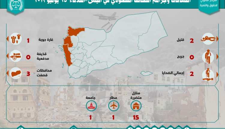 إحصائية أولية لإنتهاكات التحالف السعودي في اليمن 25 يونيو 2019 Last updated يونيو 26, 2019 للتحميل : استهداف المدنييناستهداف المنشآت الاقتصاديةاستهداف المنشآت المدنيةالضحايا المدنيين في اليمنالمركز القانوني للحقوق والتنميةاليمنرصد وتوثيق انتهاكات التحالف السعوديعاصفة الحزم Share FacebookTwitterGoogle+ReddItWhatsAppPinterestالبريد الإلكتروني